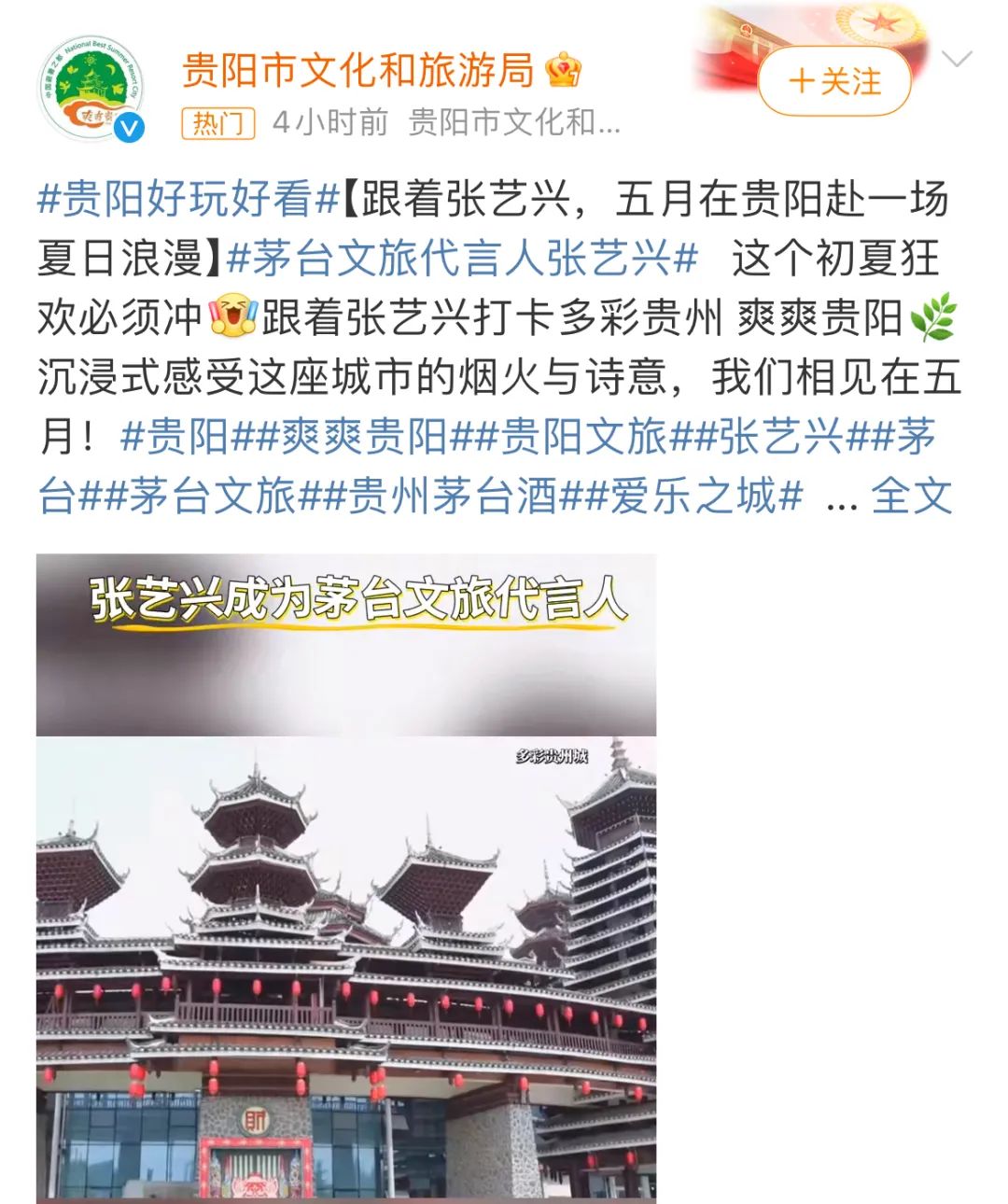 官宣不久后,贵阳文旅也发博认领,发起 #跟着张艺兴打卡多彩贵州# 的话题,进一步得到了验证。