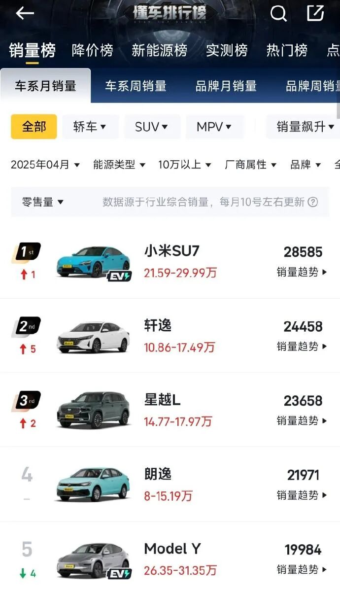 要知道,在它身后的可是曾经的市场霸主特斯拉Model Y,其4月销量为19,984辆,已被小米远远甩在身后;同时日产轩逸(24,458辆)、吉利星越L(23,658辆)等传统燃油车强者,也只能望其项背。