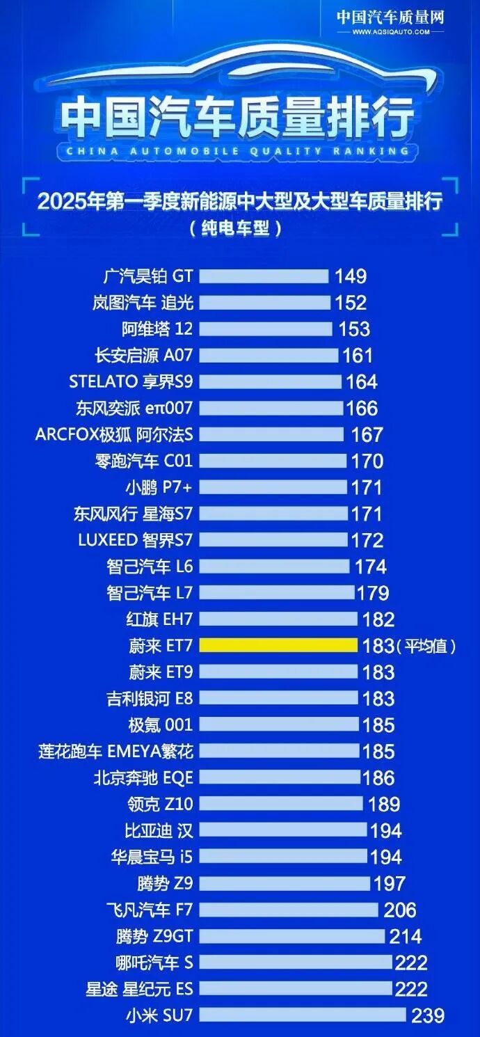 在中国汽车质量网发布的《2025年第一季度新能源中大型及大型车质量排行(纯电车型)》中,小米SU7以239分的排名垫底,成为近30款车型中的倒数第一。