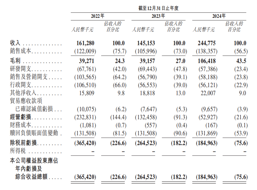 值得一提的是,尽管云迹科技曾获得资本方的青睐,而招股书显示,其募资用途为“在未来五年提升研发能力、商业化能力,其余用作营运资金或其他一般公司用途。”但其在2024年,研发投入占比却大幅降低,招股书显示,公司在2022-2024年的研发开支分别为0.68亿元、0.69亿元、0.57亿元,分别占同年总收入的42.0%、47.8%、23.4%。