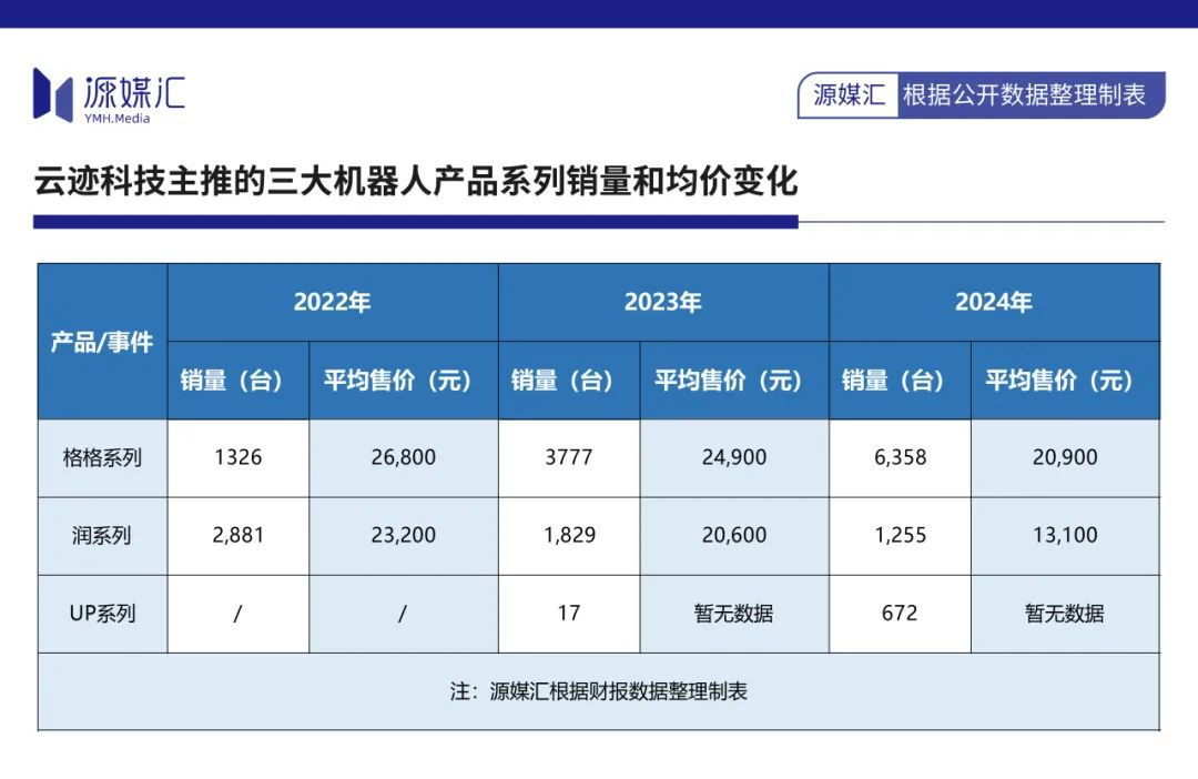 有报道显示,云迹科技“润”系列机器人的单价在2022年为2.32万元,在2024年则为1.31万元,其降价幅度高达43.8%。除“润”系列产品外,其于2023年推出的“UP”系列机器人更是在一年内降价60%,导致其售价仅有2.23万元。