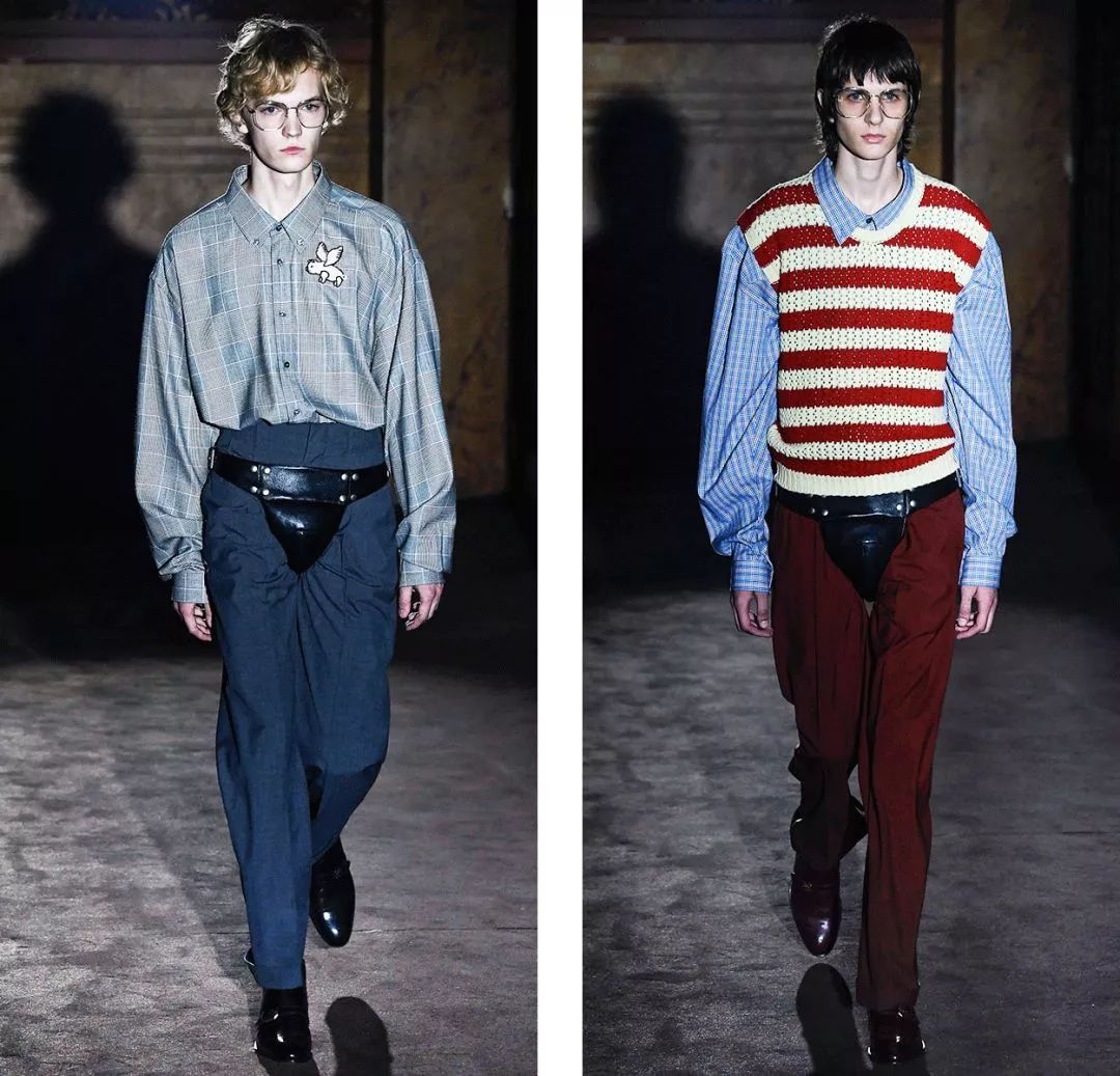 早在2018年,GUCCI就开始在裤裆部位的搭配上琢磨了一番,在秀场上展示了多款设计独特(让人看了两眼一黑)的外穿内裤,从印花到材质,每一款都试图重新定义人们对内裤穿着的认知。