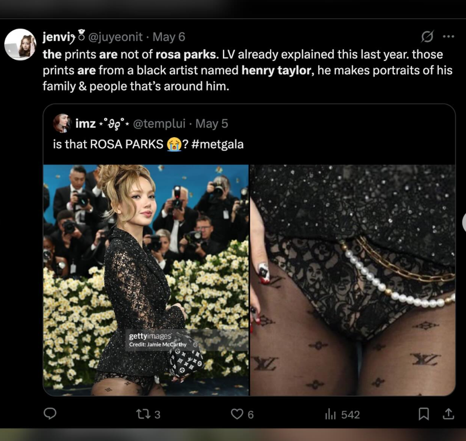 眼尖的网友发现,在Lisa这身服装的蕾丝刺绣图案中,有一张疑似美国黑人民权行动倡导者罗莎・帕克斯(Rosa Parks)的形象。
