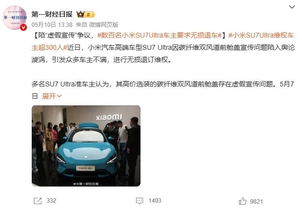 不过,并非所有声音都是负面的。5 月 10 日下午,福建首台挖孔版小米 SU7 Ultra 车主发布微博,表达了对小米及雷军的支持: