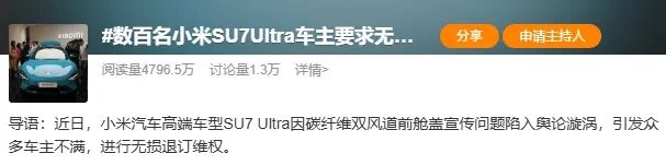微博上,#数百名小米SU7Ultra车主要求无损退车#等话题阅读量攀升至数千万,其中掺杂对小米的指责与批评,很多人表示对小米品牌好感度骤降;