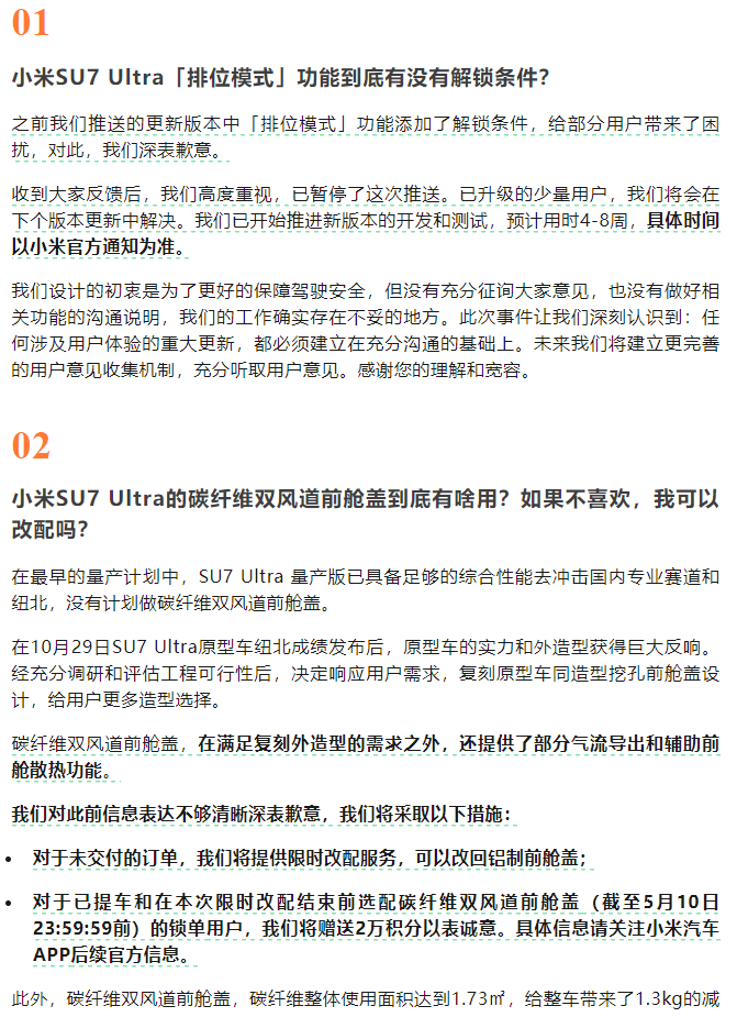 面对车主们的质疑与愤怒,5月7日小米发布致歉声明,称碳纤维双风道前舱盖“主要满足造型需求”,仅提供“部分散热功能”,表示此前“信息表达不清晰”。