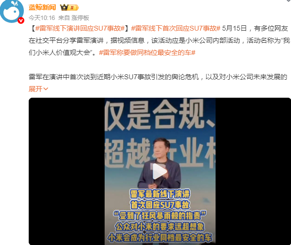 在媒体分享的雷军内部演讲中,关注度最高的莫过于小米SU7高速车祸事件。