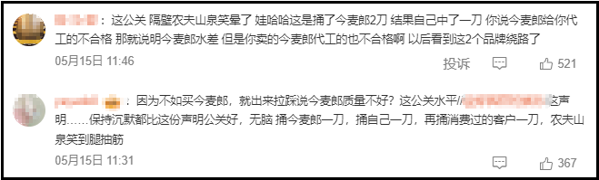 对此网友总结得很好:保持沉默都比这份声明公关好,捅今麦郎一刀,捅自己一刀,再捅消费过的客户一刀,农夫山泉笑到腿抽筋......