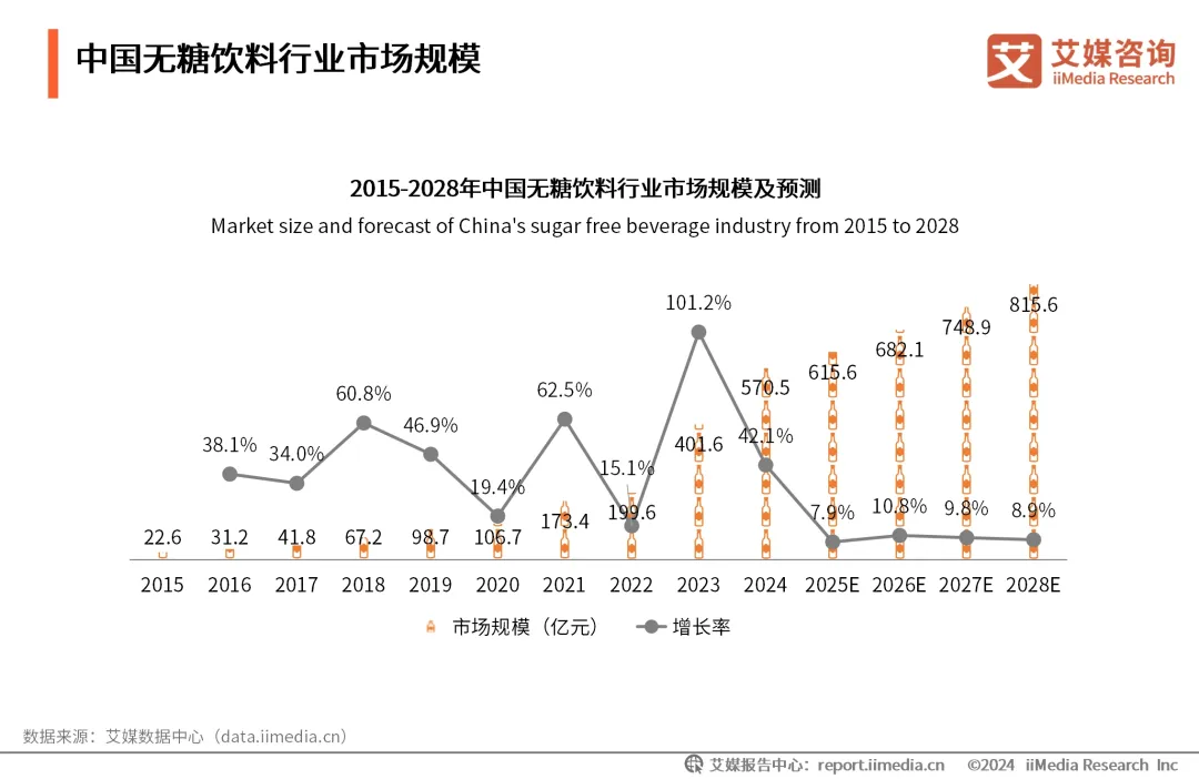 在健康趋势的影响下,国内整个无糖饮料赛道爆火。据艾媒咨询所发布的数据显示,2015~2023年国内无糖饮料行业市场规模从22.6亿增长到401.6亿,预计到2028年这一规模将会突破800亿大关。
