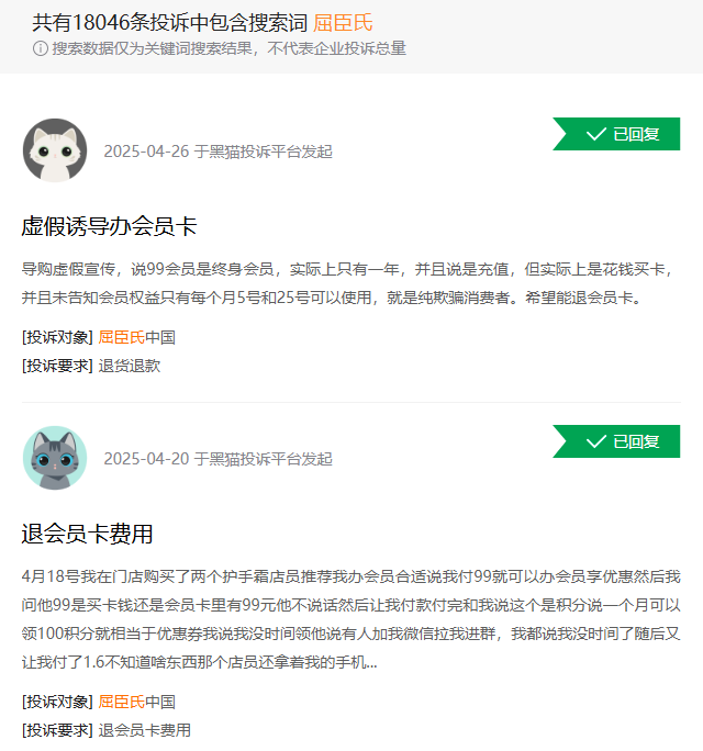 被吐槽最多的莫过于屈臣氏过度“热情”的导购,在业绩压力的影响下屈臣氏的导购几乎人人都有着注册会员的任务,同时还会给消费者进行疯狂推销,使得购物体验大打折扣。黑猫投诉平台上,有关屈臣氏的投诉量已经超过18000条,大多集中在诱导办理会员卡、退卡流程,霸王条款等。
