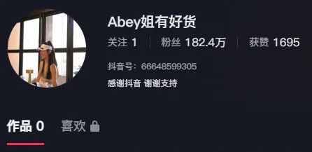 在抖音经营的两个账号,大号“Abey姐有好货”和小号“就叫 Abey”,视频作品数为零,商品橱窗也空空如也,粉丝数加起来不过260万出头,这在高手如云的直播界,初始条件可以说是相当普通了。