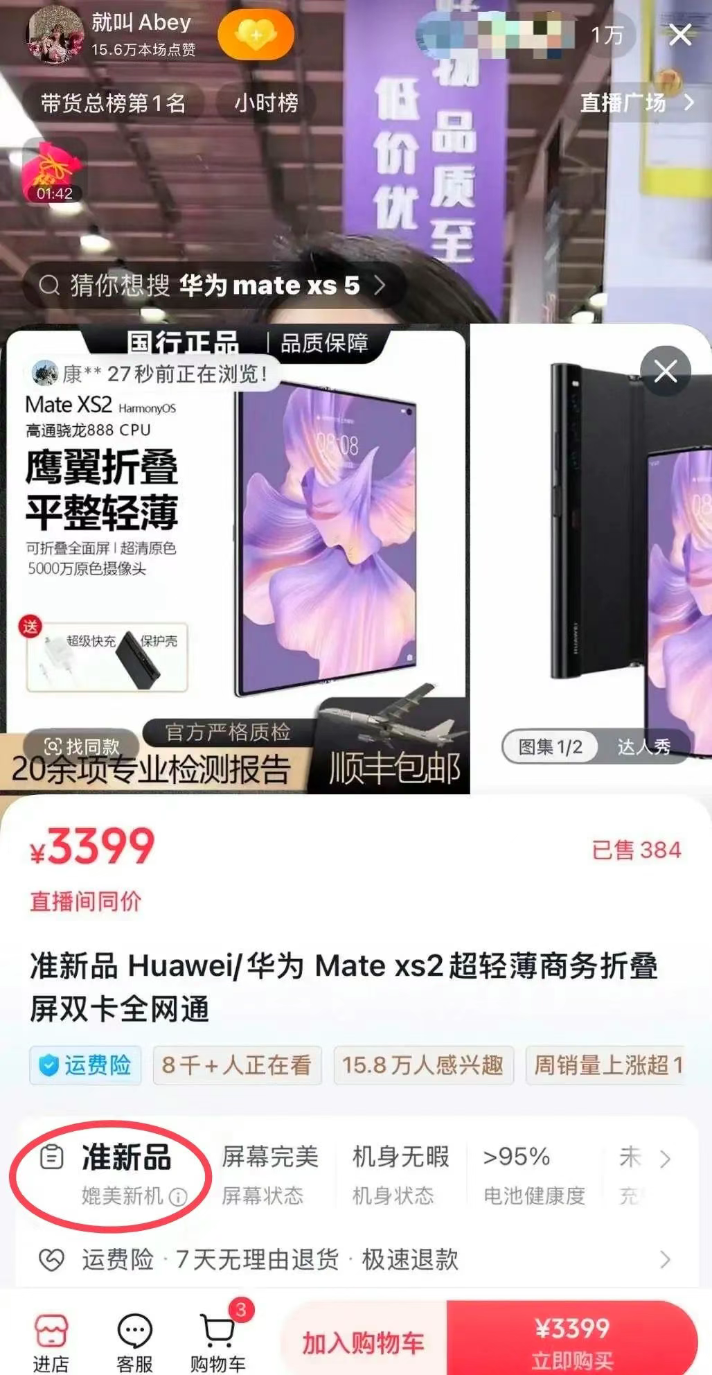 当然了,Abey姐直播间的华为也不是摆设品,不过她不送只卖!而且卖的还是2022年上市的“媲美新机”的非全新手机。