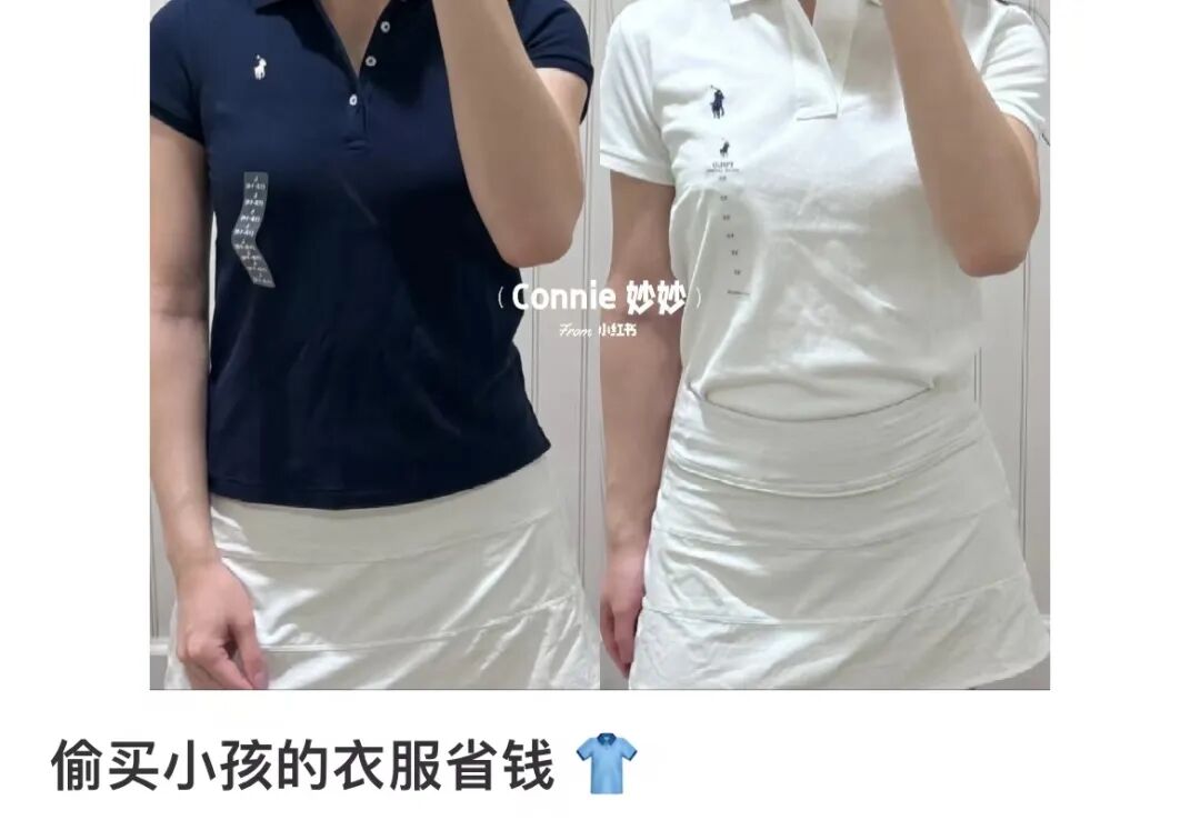一件刺绣小马标POLO 衫,成人款打完折还要 1200+,同款童装大码只要 400 元,四舍五入等于用买奶茶的钱喝到了路易十三。