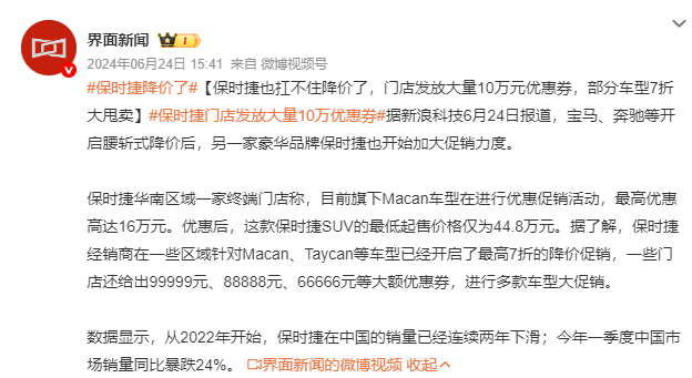 近日,保时捷在多地开启了大降价活动,从北京、天津到上海、深圳,各地保时捷中心的销售人员都在忙着接待被降价吸引而来的顾客。