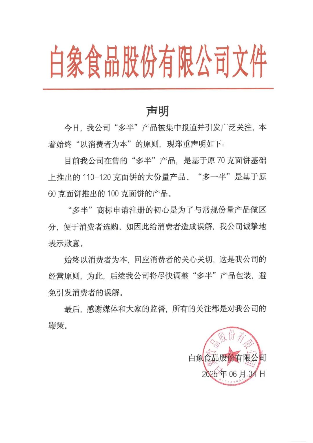 同时,白象为“给消费者造成误解”道歉,并承诺后续公司将尽快调整“多半”产品包装,避免引发误解。