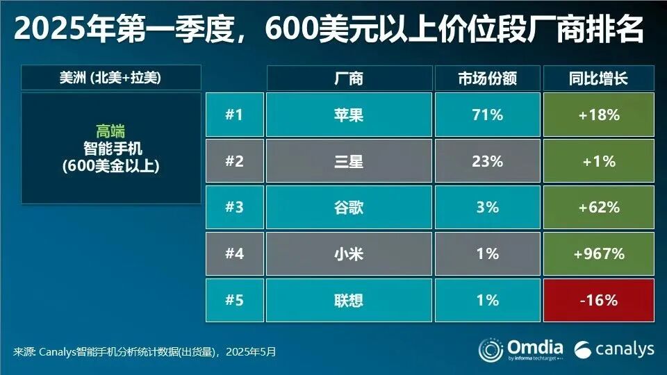 Canalys最新数据显示,2025年第一季度,在600美元以上价位段厂商出货量排名中,小米稳居第五,且以81%的加速度持平了谷歌的市场份额。