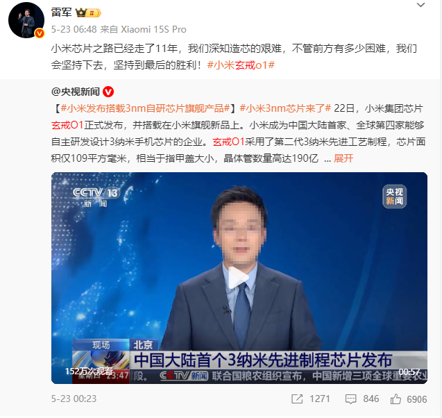 玄戒O1芯片的发布是里程碑事件,这款3nm工艺的旗舰SoC,使小米成为全球第四家、中国大陆第一家具备自研旗舰手机芯片能力的厂商。