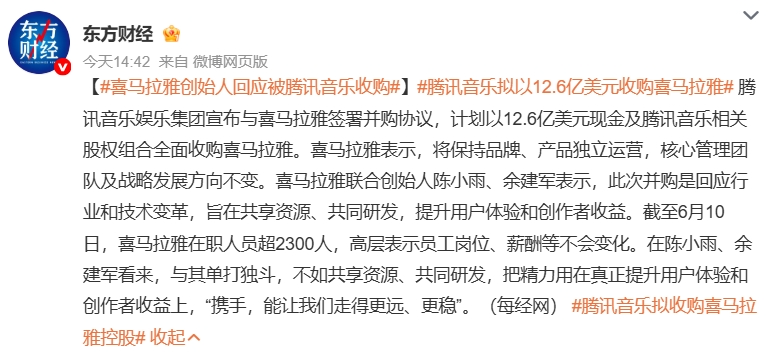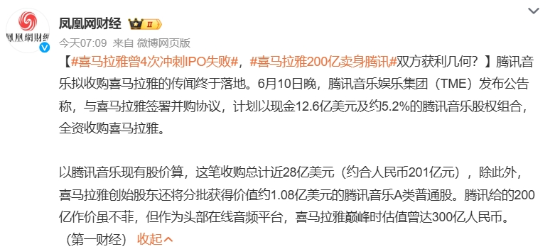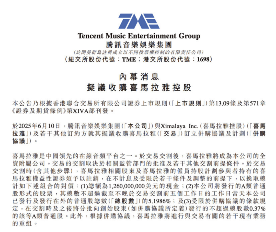 6月10日,腾讯音乐娱乐集团(以下简称“腾讯音乐”,TME、HK1698)正式宣布以12.6亿美元现金加股权的形式全资收购喜马拉雅;收购完成后,喜马拉雅将成为腾讯音乐旗下的全资附属公司。