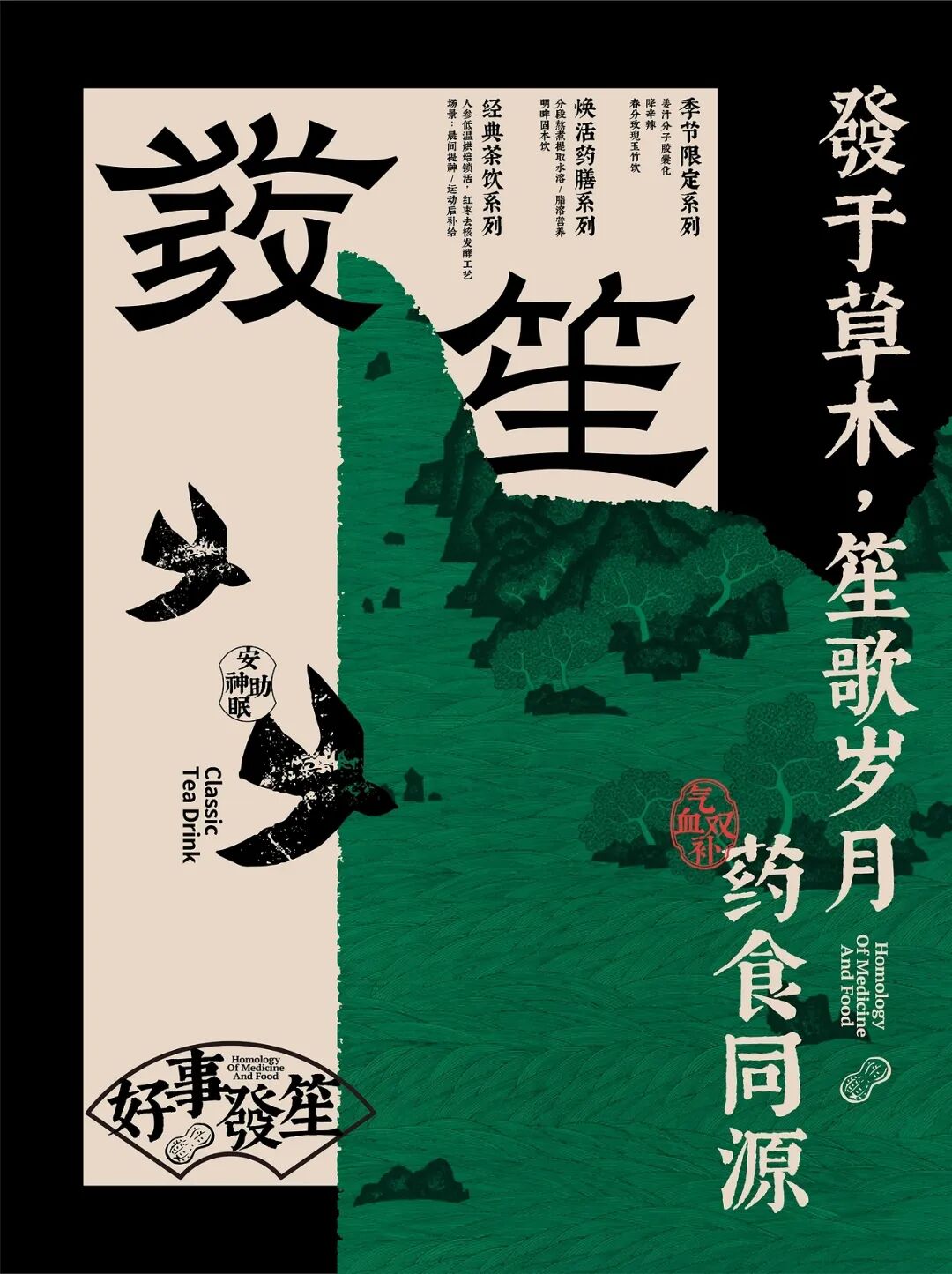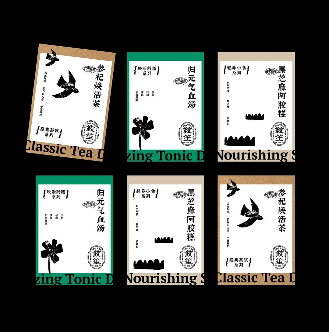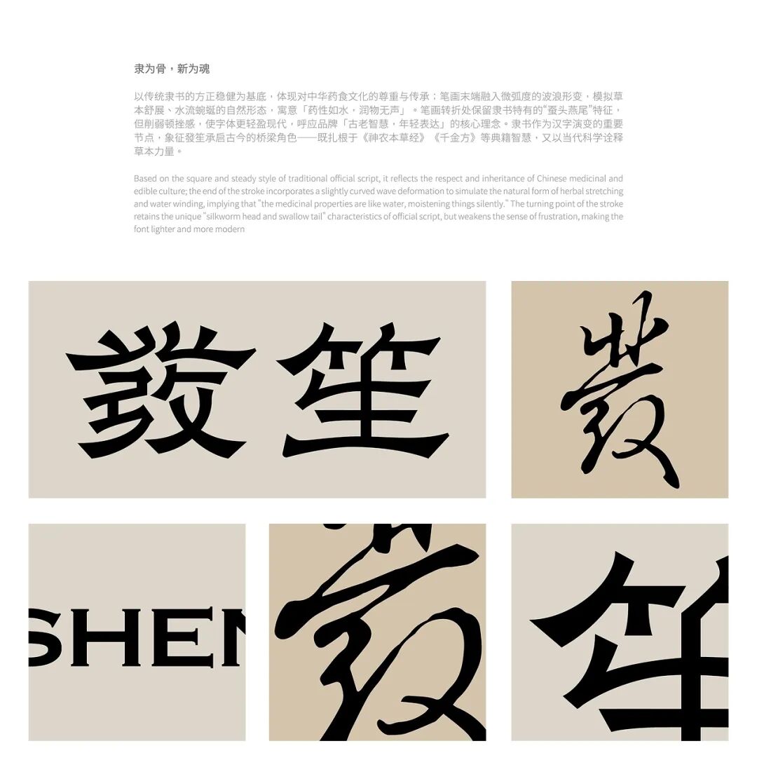 设计方面,品牌名以传统隶书的方正稳健为基底,体现对中华药食文化的尊重与传承,笔画转折处保留隶书特有的“蚕头燕尾”特征,呼应品牌「古老智慧,年轻表达」的核心理念。