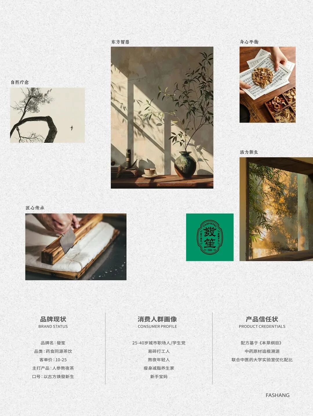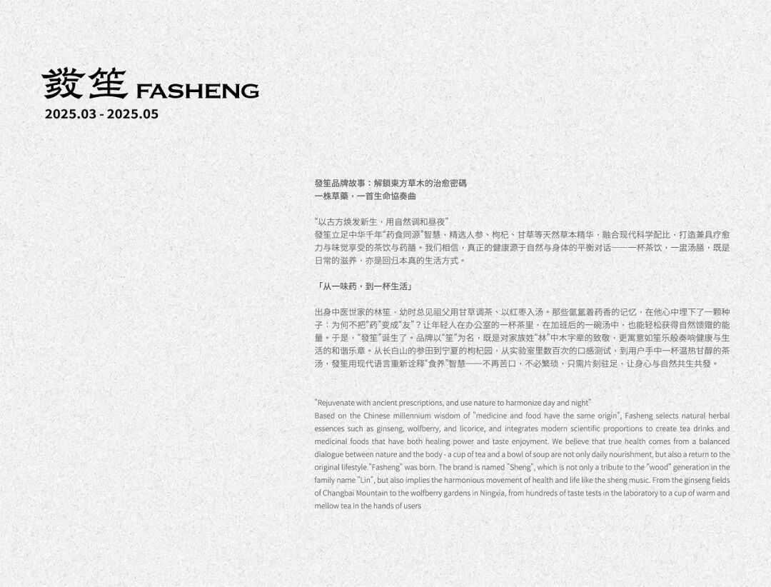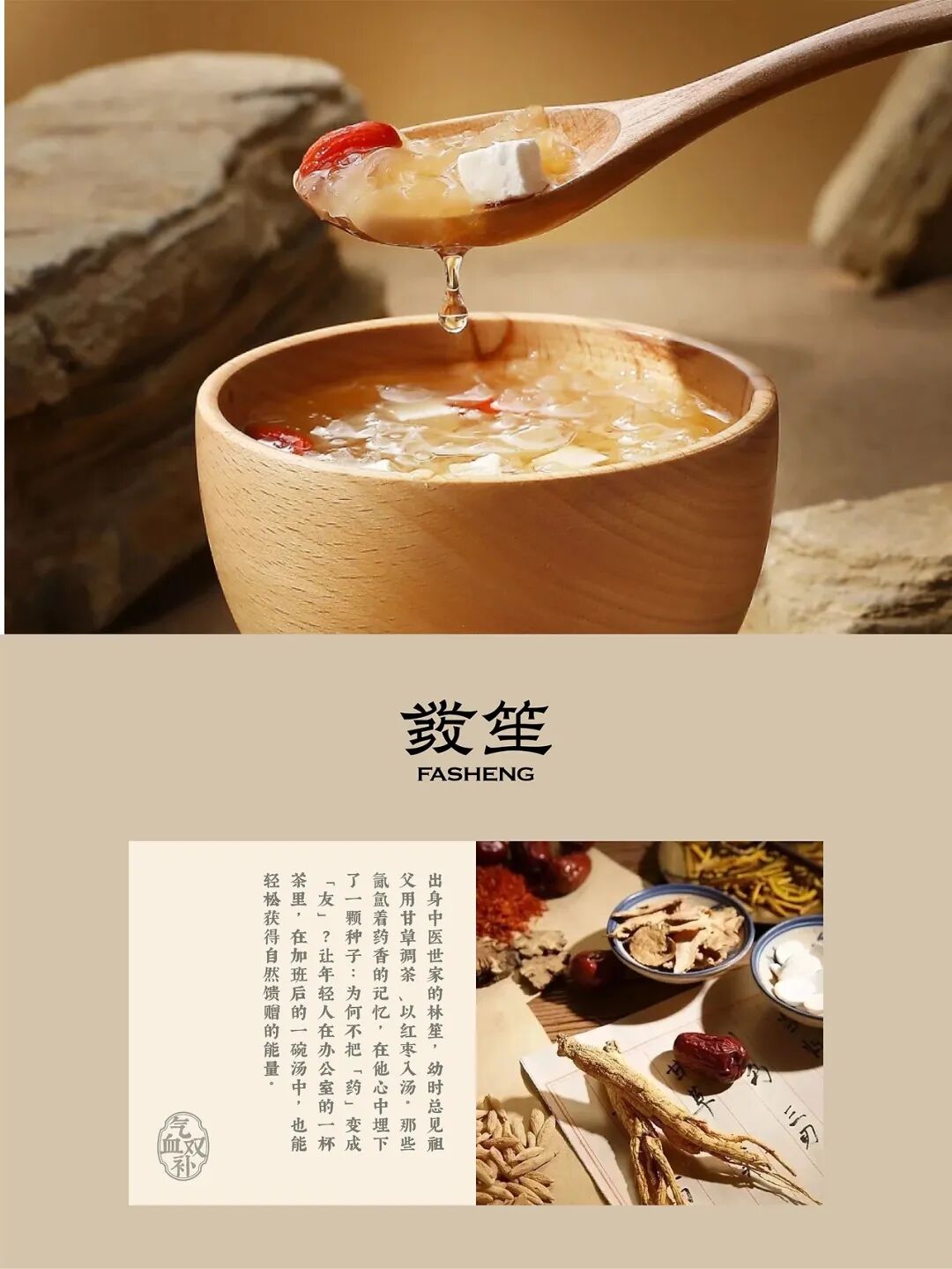 品牌以“笙”为名,既是对家族姓“林”中木字辈的致敬,更寓意如笙乐般奏响健康与生活的和谐乐章。發笙用现代语言重新诠释“食养”智慧--不再苦口,不必繁琐,只需片刻驻足·让身心与自然共生共發。而以“發”象征生命力勃发与健康传承,“笙”寓意和谐平衡的养生韵律,品牌立足药食同源文化,将千年中医智慧与现代生活方式融合,倡导“食养为基,药补为辅”的自然调理理念。通过药膳产品传递“由内而外焕发生机”的健康哲学。