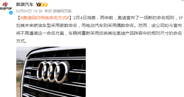 还记得今年初,奥迪宣布放弃此前以奇偶数区分电动车与燃油车的命名规则,该举动是为了纠正之前的命名在全球范围内产生了认知混乱、用户抵触的负面影响。