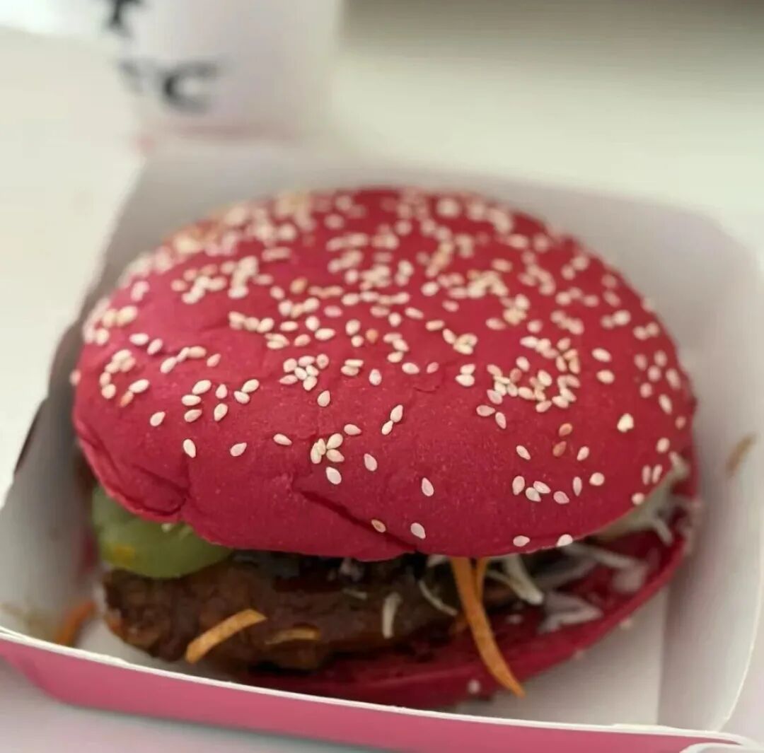 要知道,食品界很少采用鲜艳、饱和度高的颜色,这抹粉皮汉堡光是视觉上就透着诡异,让人毫无食欲。