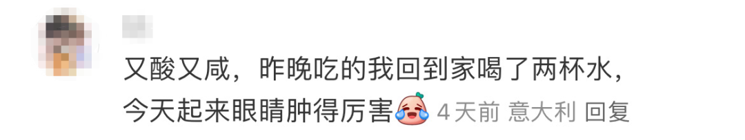 有网友形容口感“又酸又咸”,吃完疯狂喝水,以至于眼睛都水肿了。