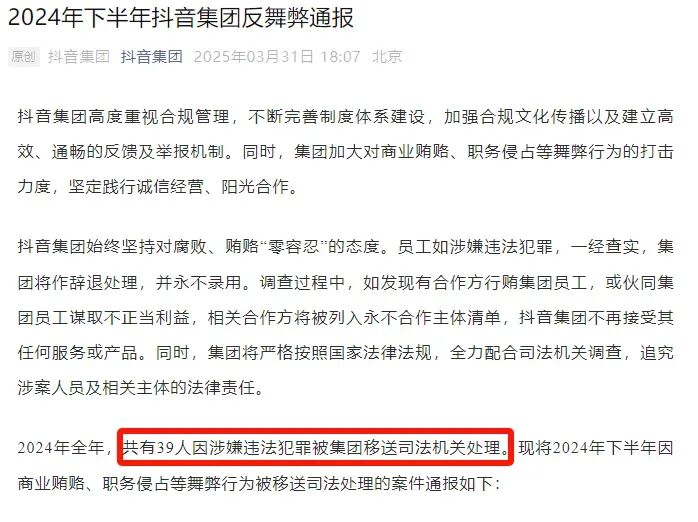 就以抖音在今年3月31日发布的《2024年下半年反舞弊通报》为例: