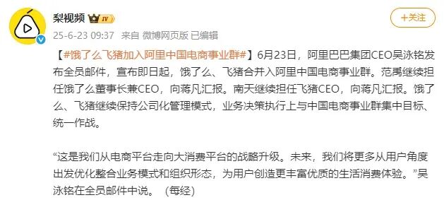 就在今日,阿里巴巴集团CEO吴泳铭发布全员邮件,正式宣布饿了么与飞猪合并入中国电商事业群。
