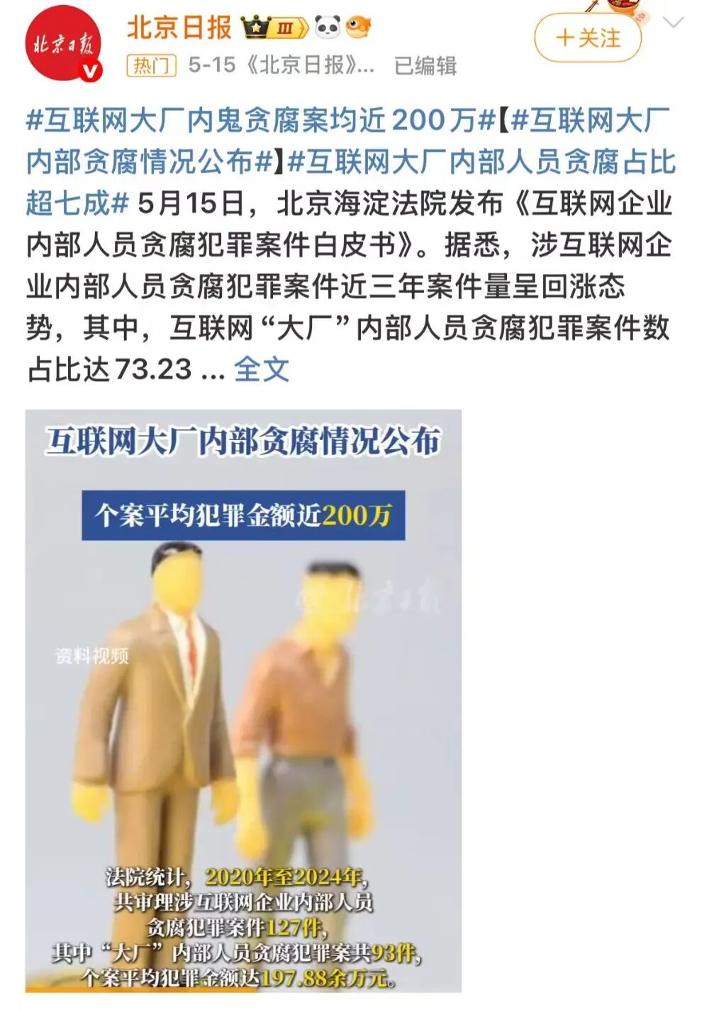 就在5月中旬,据北京日报报道,在北京海淀法院发布的《互联网企业内部人员贪腐犯罪案件白皮书》中,数据显示: