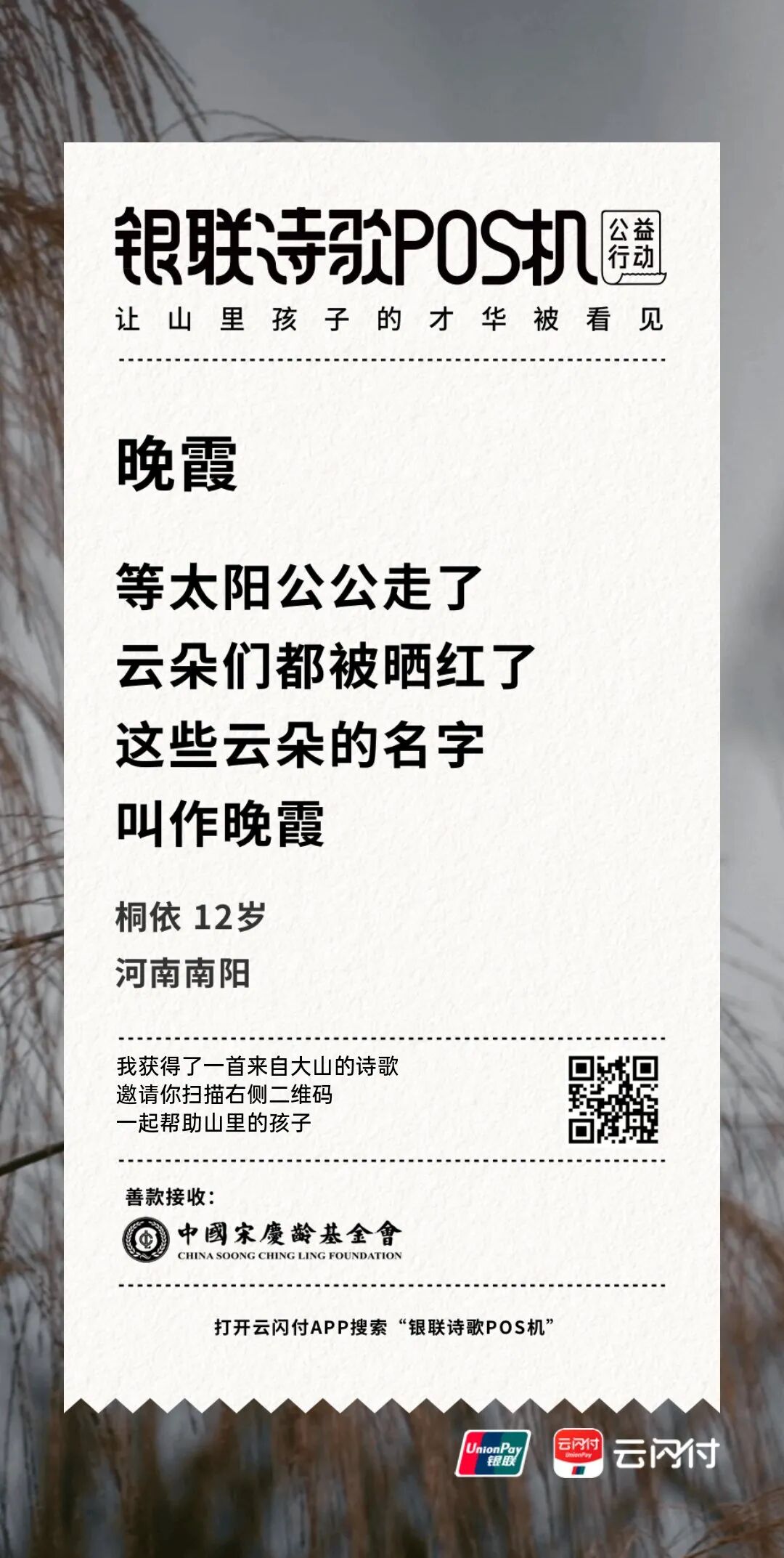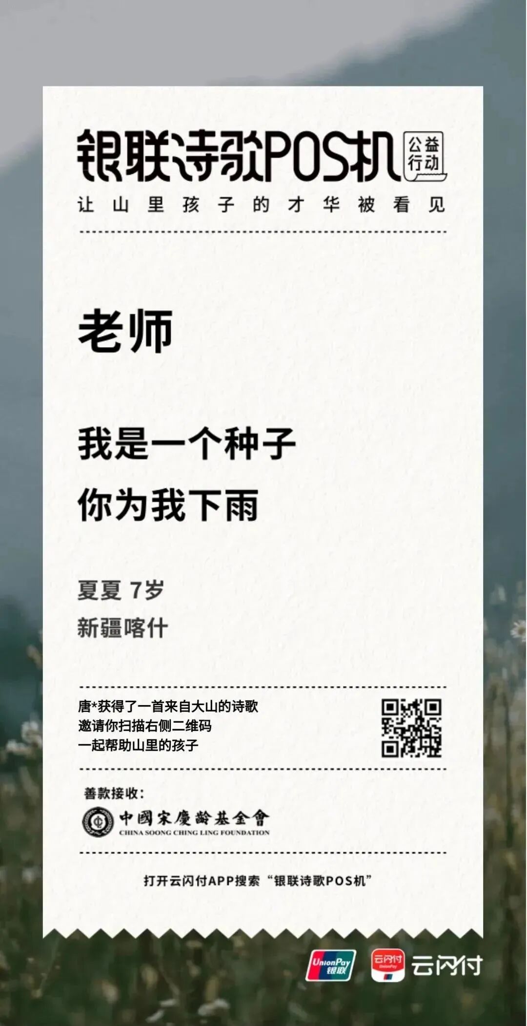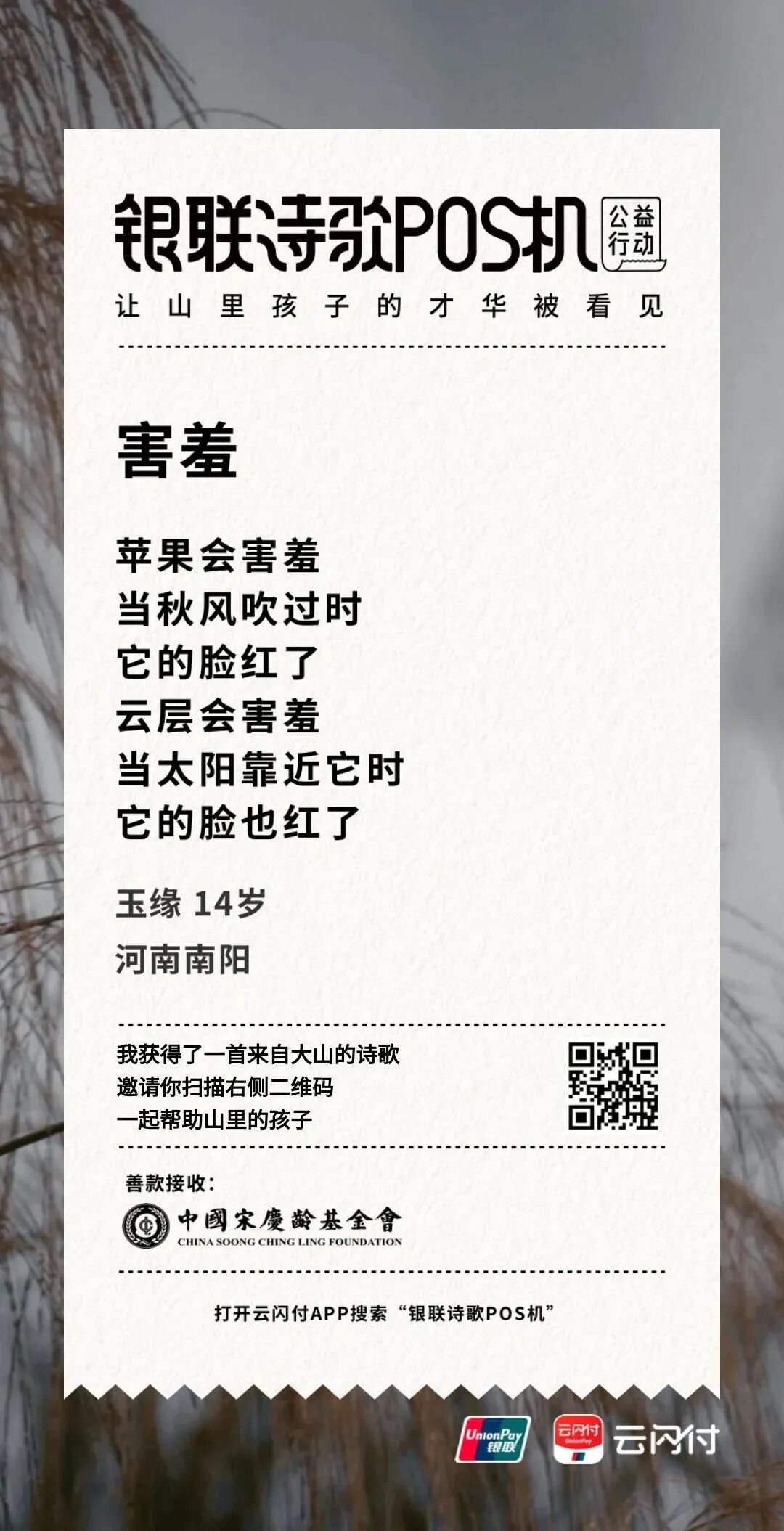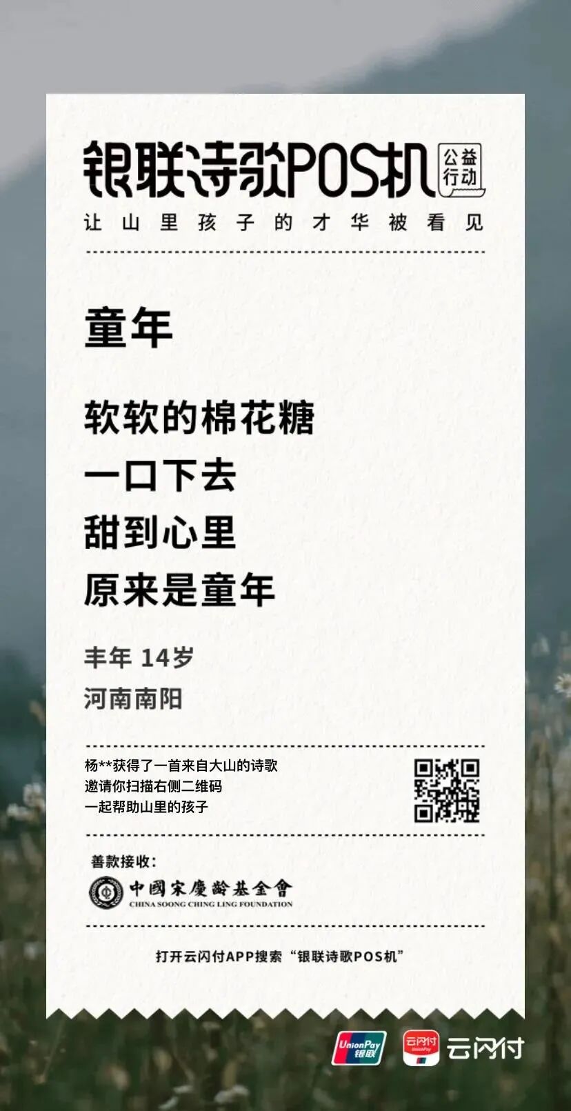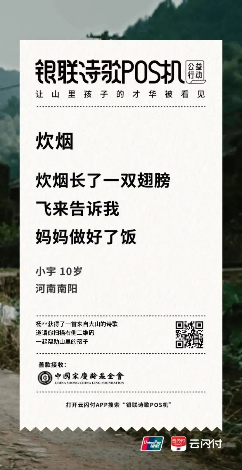 为了让更多人看到山里孩子的才华,不让时空阻隔人们对公益的热心,中国银联在今年开启诗歌POS机线上版,「银联诗歌POS机」公益小程序正式在云闪付APP中上线,这些来自大山的诗意,如今打开云闪付APP,点击首页公益入口或搜索“诗歌POS机”就能看到。
