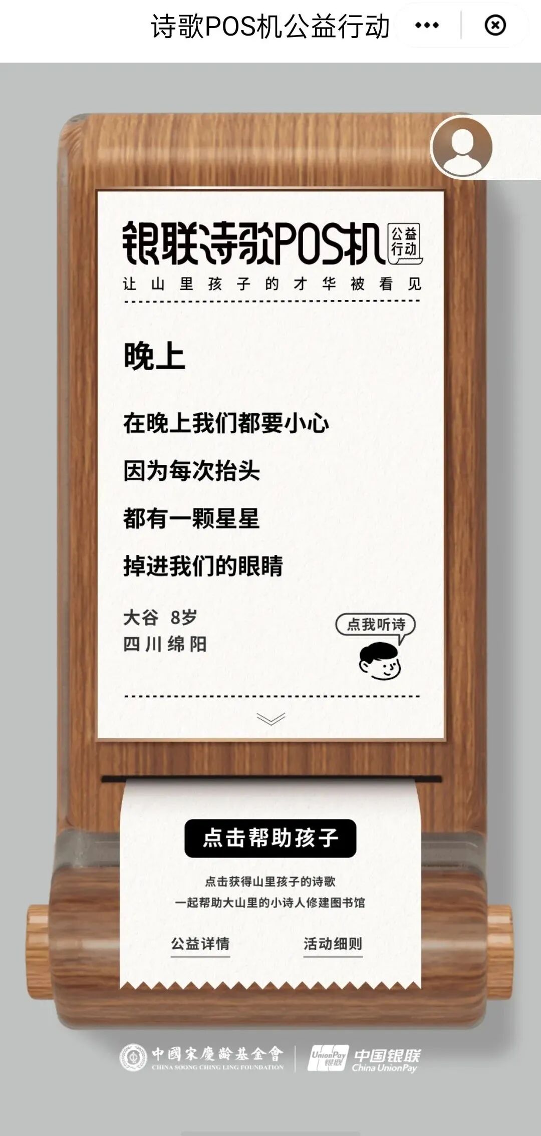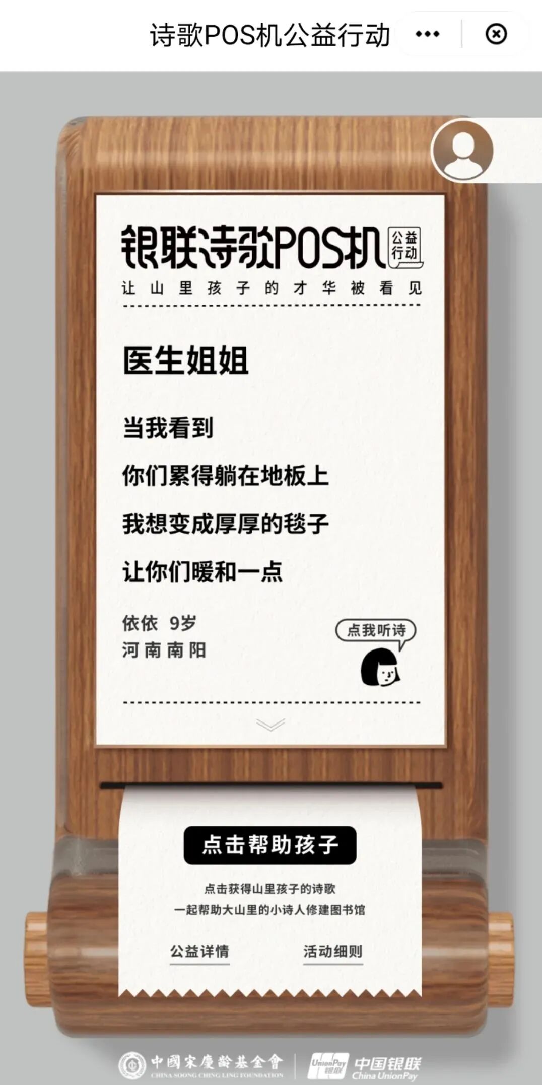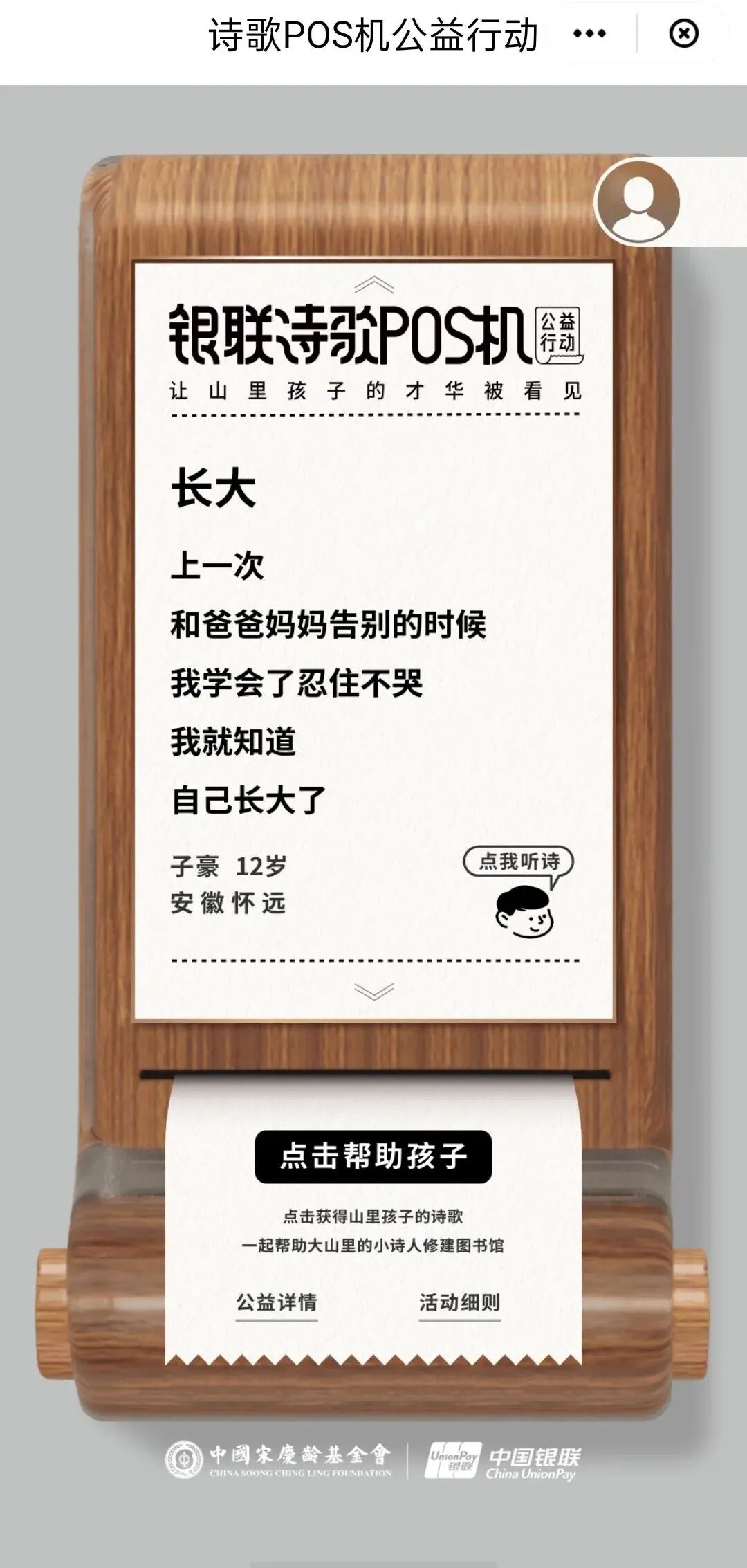 除了展示的三首,用户也可以点击“帮助孩子”按钮,获得更多的诗。每助力一次,可收到一首孩子们写的诗,每人每天可助力三次,而用户的每一次助力,中国银联都会小诗人图书馆捐出一分钱。