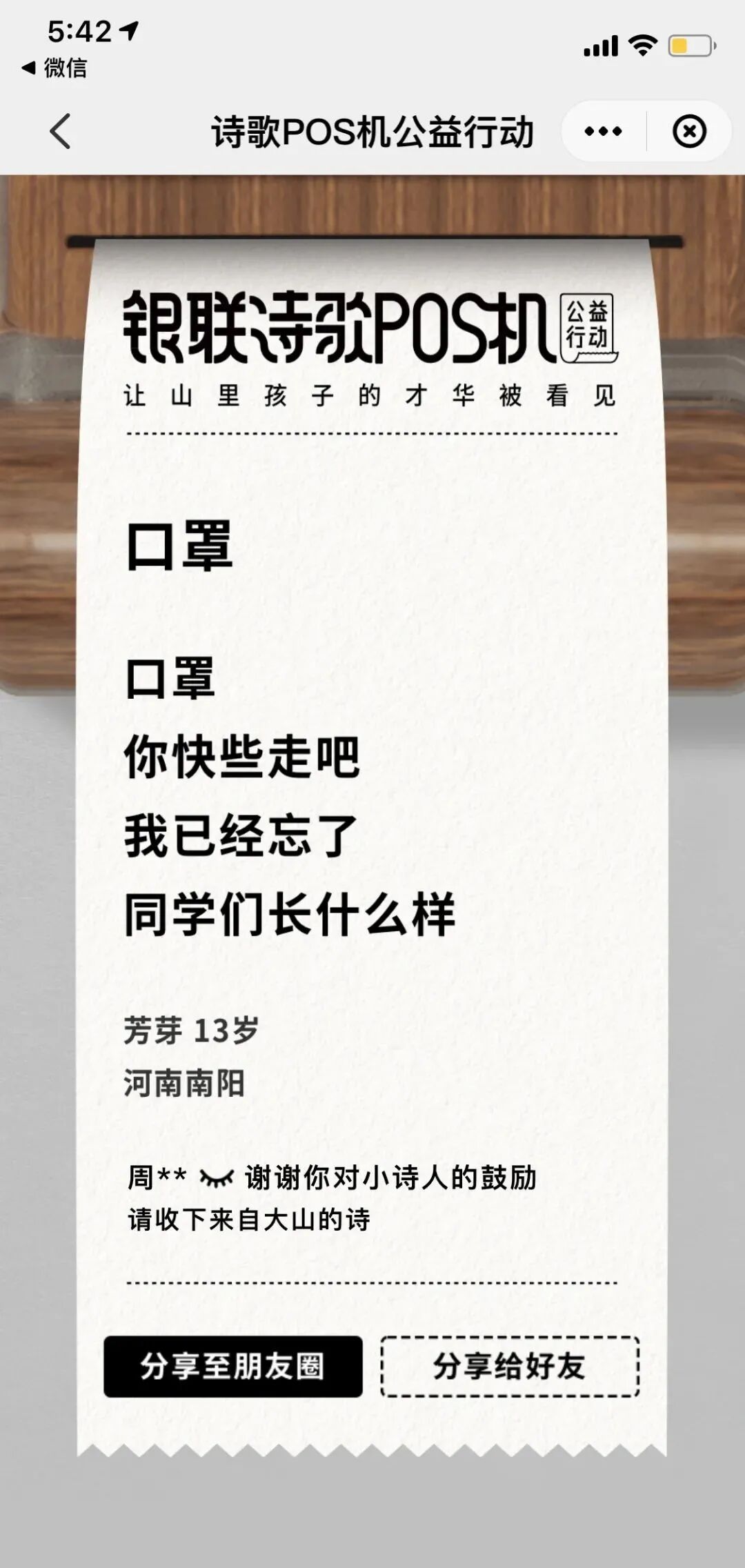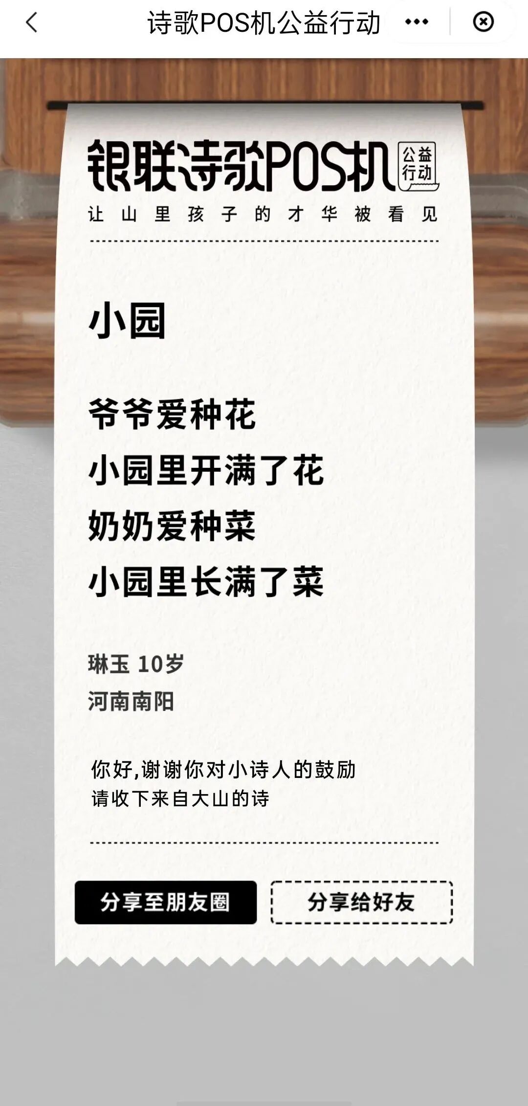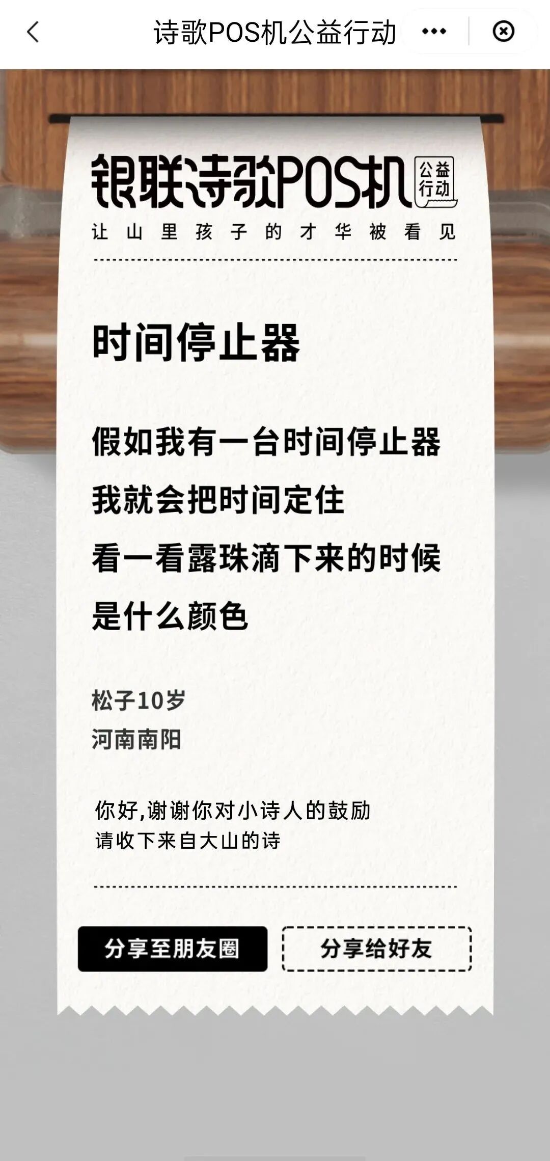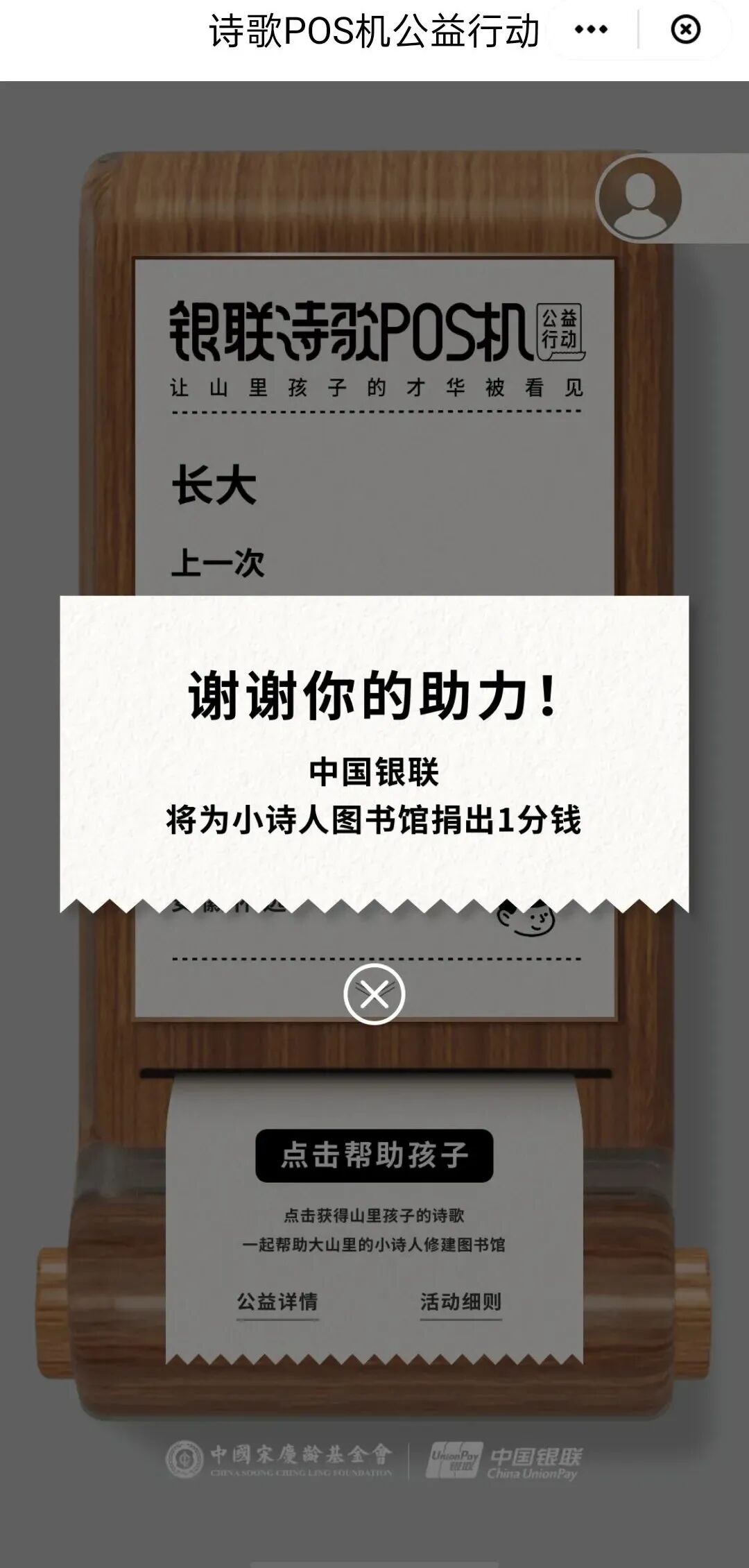除了展示的三首,用户也可以点击“帮助孩子”按钮,获得更多的诗。每助力一次,可收到一首孩子们写的诗,每人每天可助力三次,而用户的每一次助力,中国银联都会小诗人图书馆捐出一分钱。