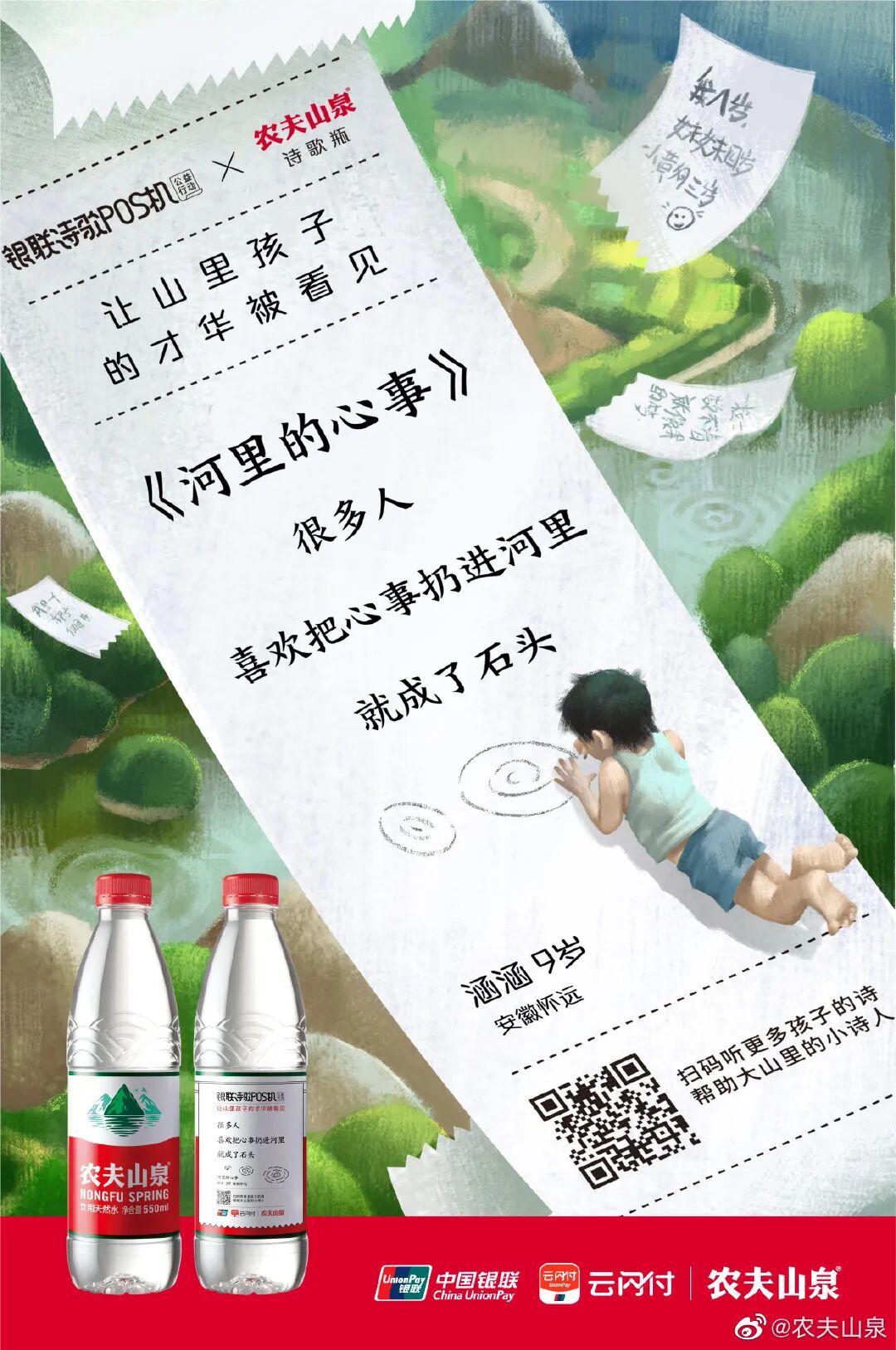 银联还与农夫山泉展开跨界合作,把大山里的孩子们的诗,印在来自大山的“山泉”瓶上,借助农夫山泉的瓶身,将产品变身媒介,进而推广孩子们的诗歌。