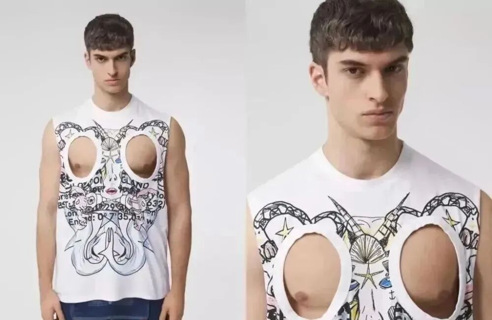 背心被撕得只剩中间一小块布,模特胸部若隐若现,满满的寒酸感,这年头乞丐都不穿这么破烂的衣服。