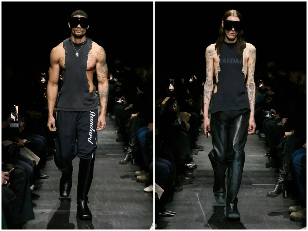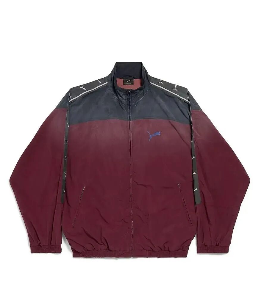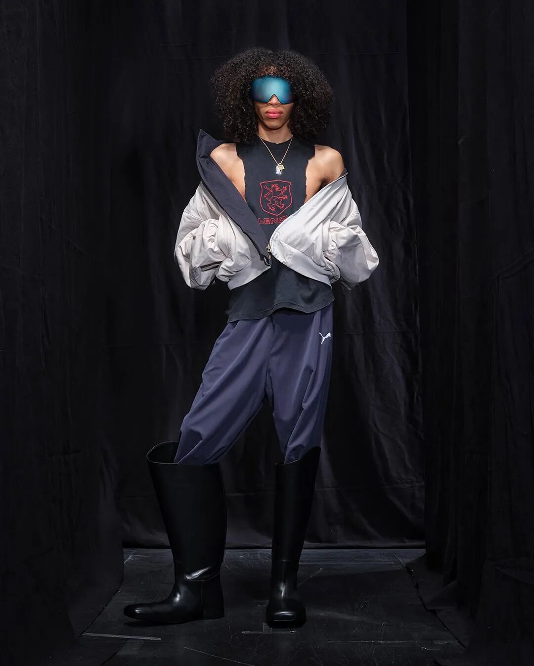 另有一套做旧尼龙运动装,灵感源自90年代PUMA经典档案。但Demna加入了解构剪裁,模特穿上后宛如“刚从赛车场退役的华尔街之狼”。
