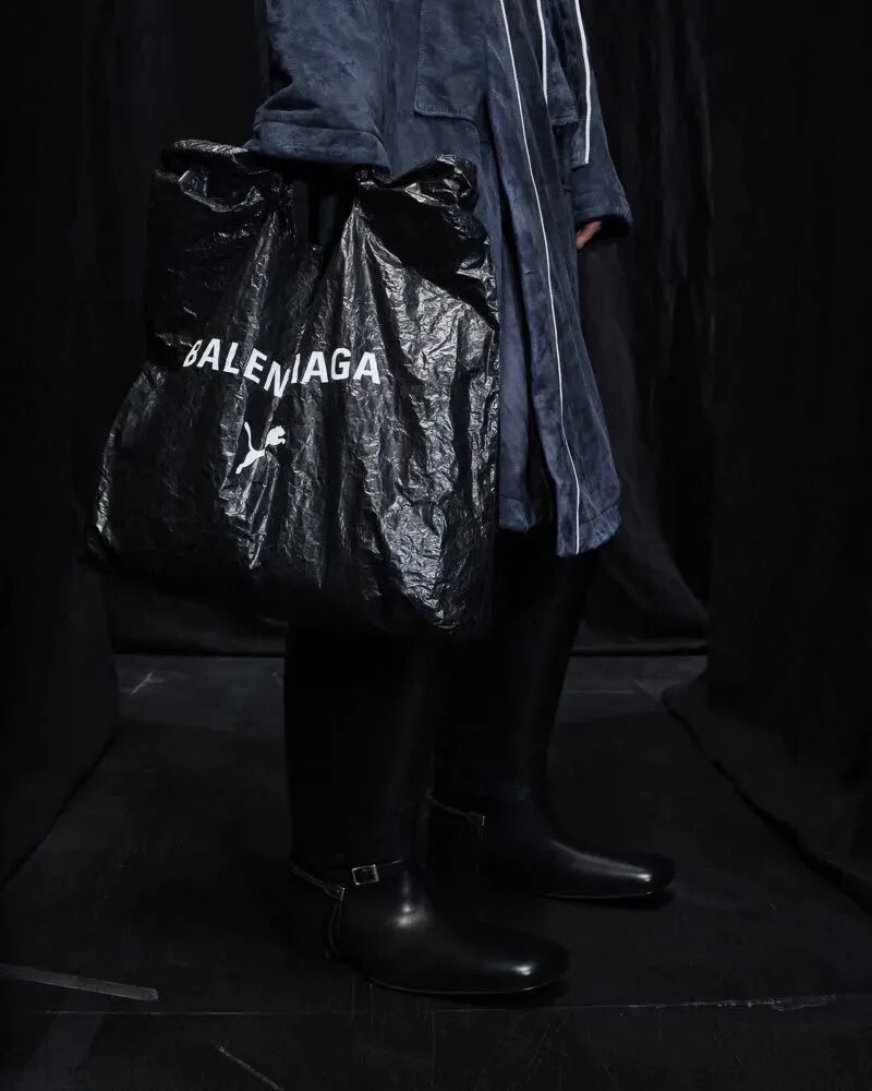 要知道,巴黎世家那些年的炸裂设计——露乳装、垃圾袋包、泥浆秀全是Demna的手笔。这次,他依然没让人失望,在秀场上祭出“巴黎世家×PUMA”联名系列。
