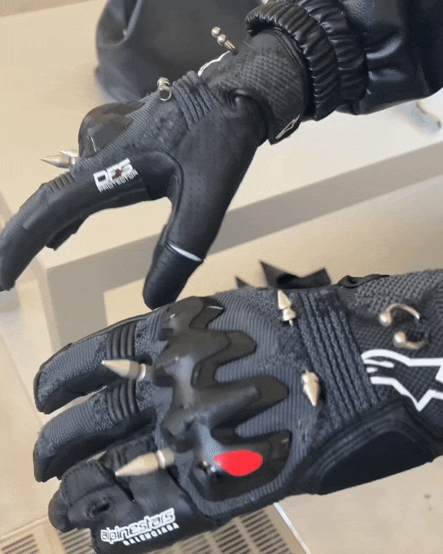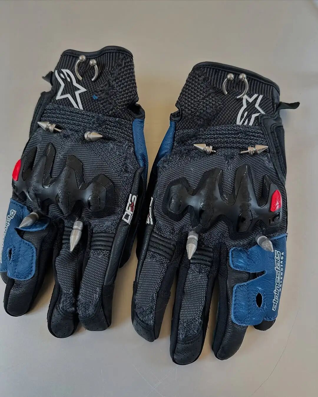 配饰方面,AlpineStars机车手套朋克穿孔尖刺,表面做了旧化磨损处理,尖刺装饰让人沉默了,这是准备上战场,还是去地铁站防身?”