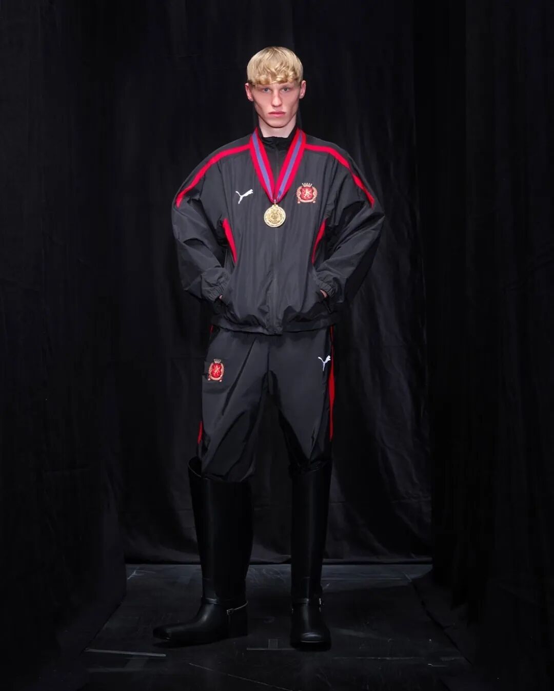 与PUMA的合作涵盖了皮质厚夹克、冲锋衣、运动裤、连帽拉链卫衣等等,模特们身着PUMA运动套装,颈间带着金牌宛如赛场归来的健儿。