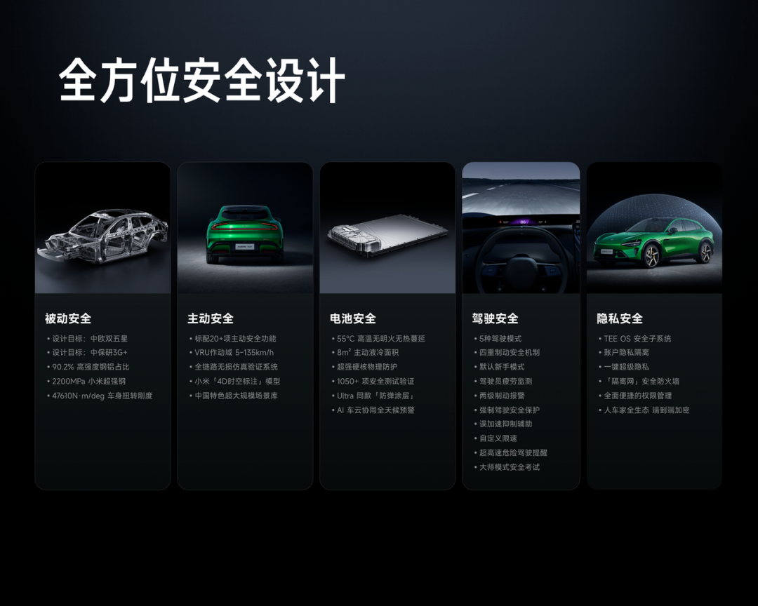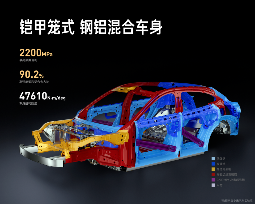 被动安全上,小米YU7全车采用2200MPa超高强度钢,超过了特斯拉马氏体钢的1700MPa和沃尔沃硼钢的1600MPa。车身结构采用“铠甲笼式”混合设计,全方位提升抗撞性。