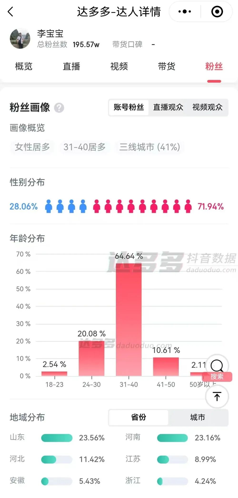 要知道,达多多数据显示,李宝宝的粉丝里,有超过七成都是女性,且年龄集中在31-40岁之间——李宝宝的带货品类,无疑直接与粉丝的喜好挂钩。