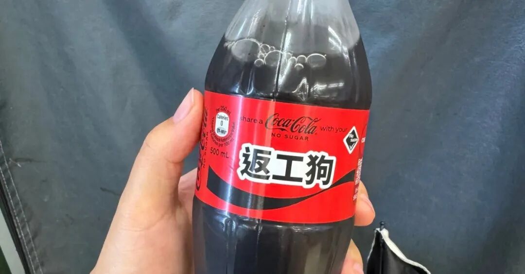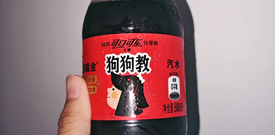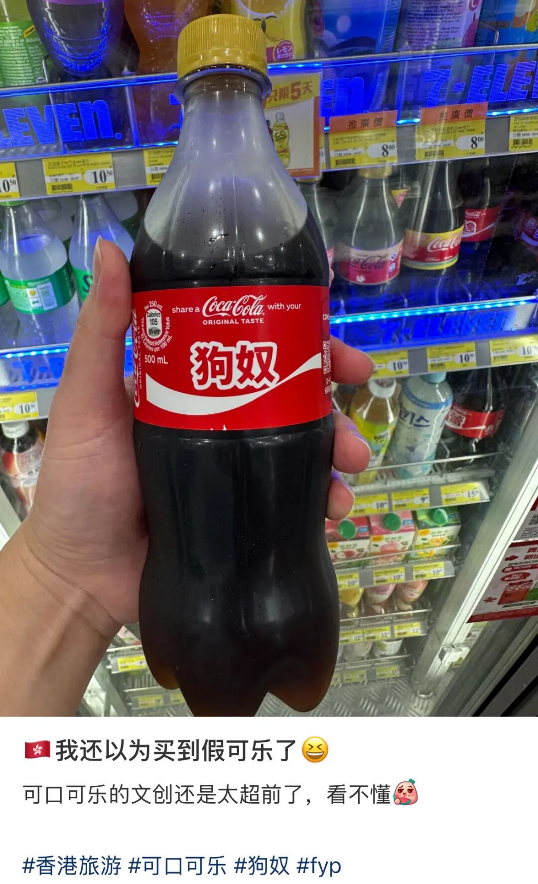 定睛一看,原来是可口可乐香港地区推出的创意分享瓶,上面印着“狗奴”二字。