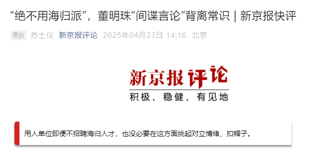 胡锡进也坐不住了,指责董明珠违反劳动法,构成身份歧视,要求她向海归群体公开道歉。