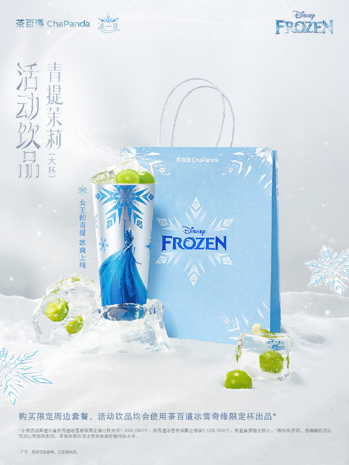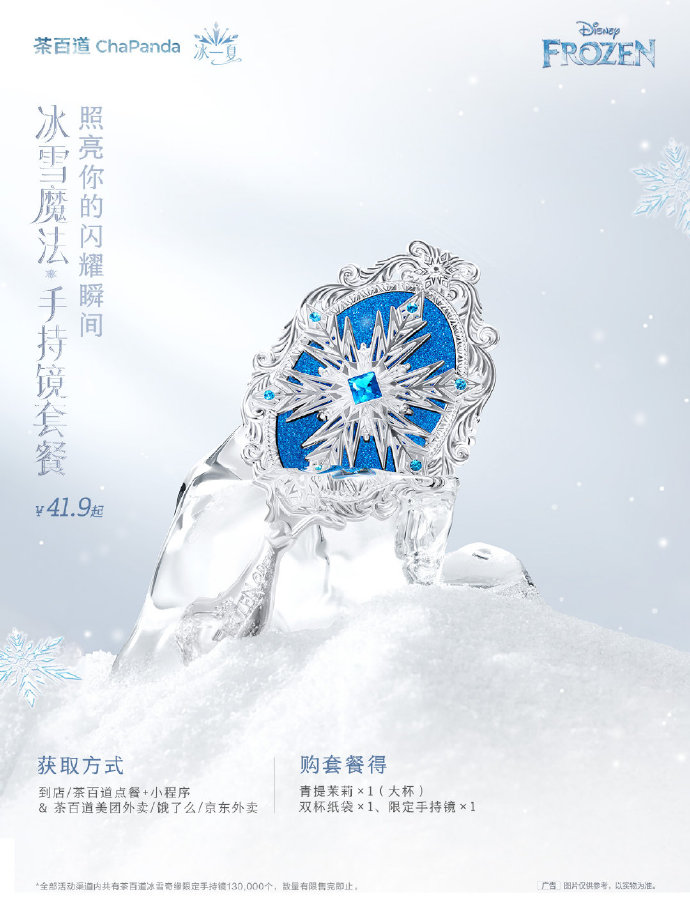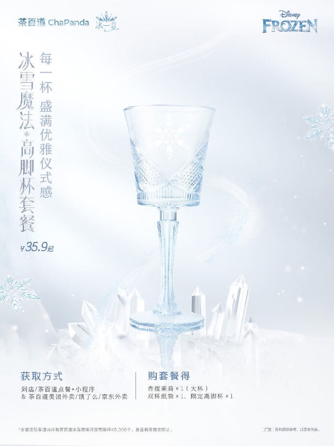 炎炎夏日里,茶百道推出了冰雪奇缘限定温变杯,遇冷变身。另外还有冰晶手机链、蓝玻高脚杯、重工手持镜和限定纸袋等着大家来拿。