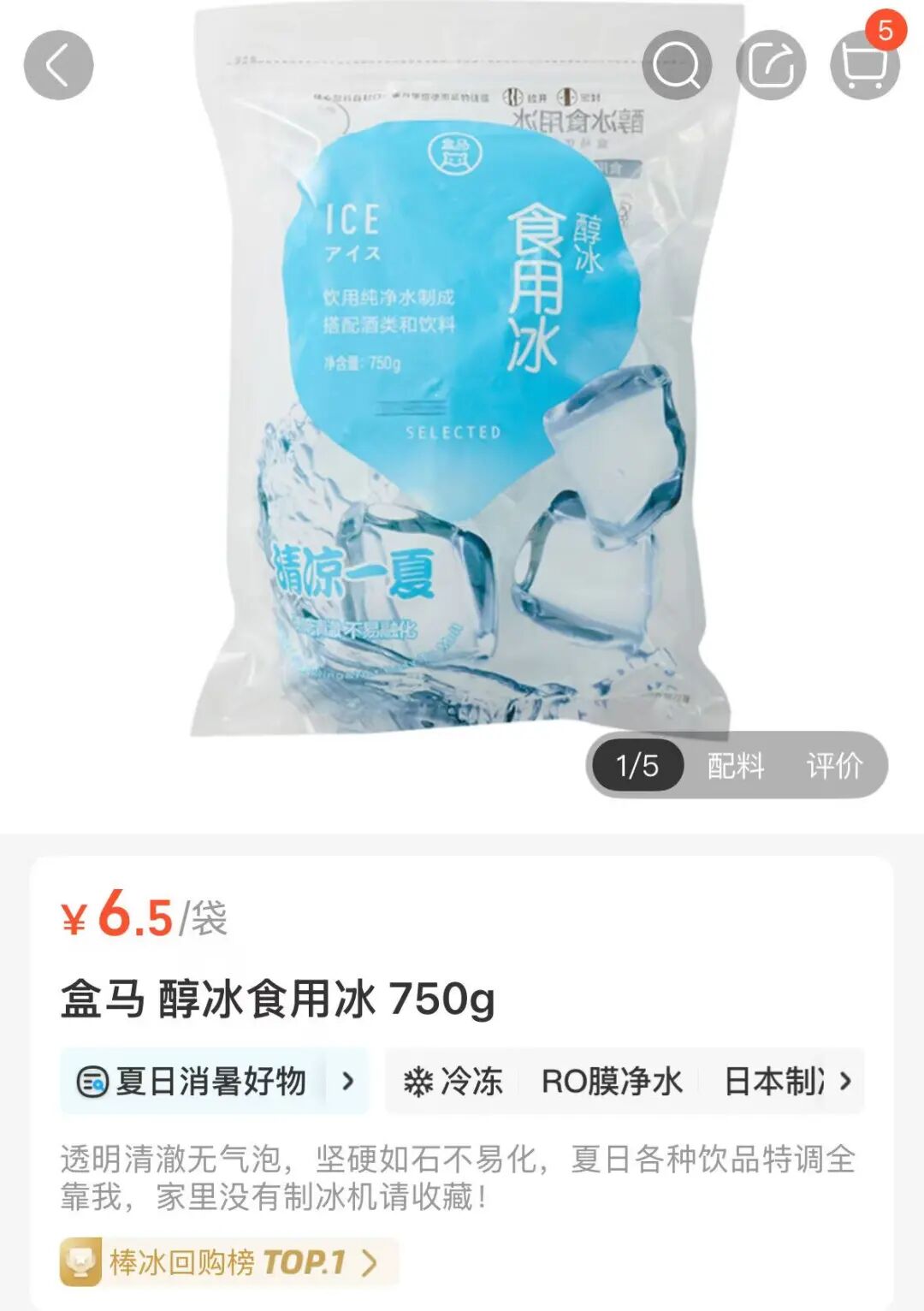 盒马的750克醇冰食用冰,售价6.5元一袋,算下来一公斤大概8.7元;麦德龙3公斤冰块售价22.89元,一公斤才7.63元。