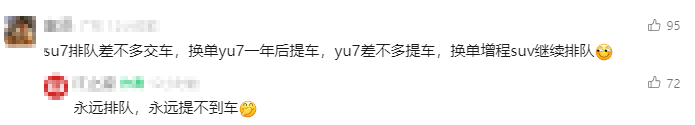 目前YU7的交付时间已经拉长至9个月甚至一年以上,标准版需要58-61周,Pro版51-54周,Max版39-42周;SU7的交付周期也不短,标准版40-43周,Pro版37-40周,Max版32-35周。