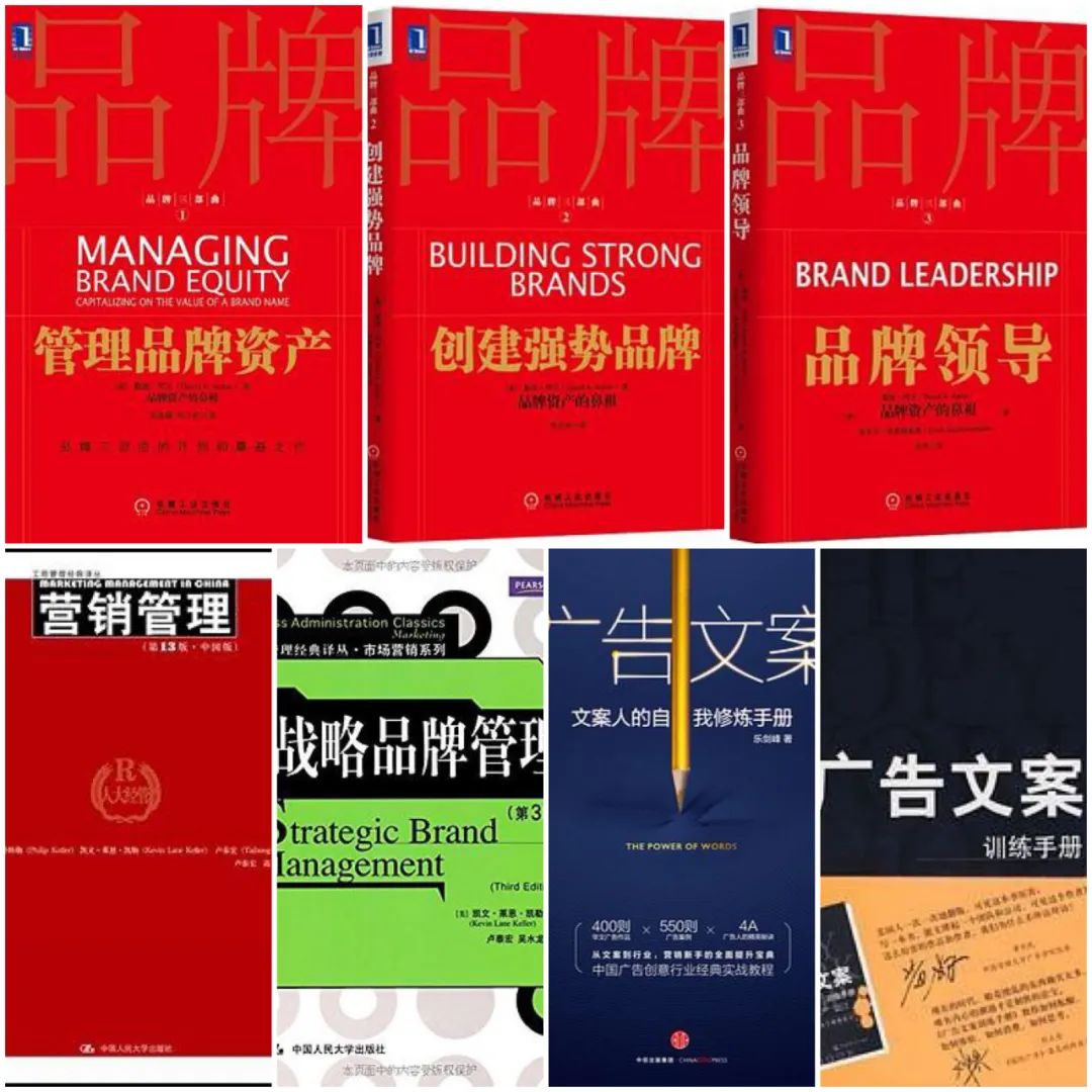 品牌类:《品牌三部曲》(戴维阿克的)《战略品牌管理》广告类:《文案训练手册》(本丁格尔)《广告文案》(乐剑锋)在这些之外,我还会阅读一些教人如何投资的书,学习投资人分析经济、观察行业、判断公司的方法和理论,从行业到价值链到产业链全面了解一家企业,更深入理解一个品牌。我的阅读习惯是,以完整阅读建立初步知识体系,辅以碎片化阅读及时补充不足。首先,至少将每本书完整的看两到三遍(有些书会看更多遍),必要的时候用思维导图整理框架和主要知识点,这样一来,你对这个领域的底层知识体系就有了初步认识,并在大脑里建立逻辑结构。当对整本书的逻辑体系相对了解之后,每隔一段时间就可以把书拿出来,快速翻阅一遍,强化知识上下的上下联系。另外,我还会把所有书放在kindle中,阅读的时候随时做笔记,需要用到,或者看文章时想到某个知识点,便会及时打开手机搜索提取知识,通过碎片化的时间不断加深理解。长期跟踪研究某些品牌,是为了练习分析“why”和“How”的能力。