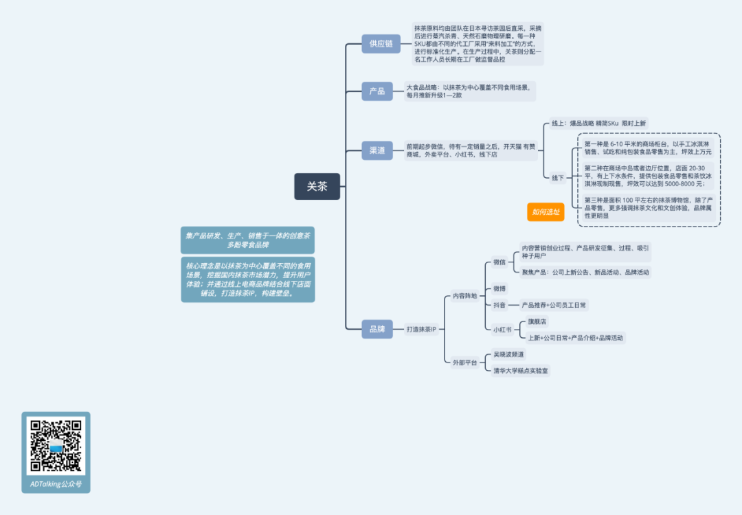 当某品牌被加入list后,首先我会以思维导图全面分析品牌从供应链、渠道、团队、产品、营销的架构,做初步了解,后期在浏览中会特别关注他们的大小新闻,并把重要信息以链接的形式加入到对应的思维导图栏目中,不断丰富。例如,如果是品牌发布新品,我会把新品信息以链接形式加入到“产品”一栏,如果是有新的品牌campaign,我会搜集资料,以链接形式加入到“营销”一栏,如果是创始人或核心团队变更,则会把信息加入“团队”一栏。这样,整个思维导图像树一样生长,枝繁叶茂,你掌握的信息越多,对品牌的理解也越发全面和深刻,由此及彼,对其他品牌的理解也是一样。乙方人很难真实体验和了解一个产品从生产到消费者手中这中间的复杂过程,所以用这种方法练习,即使你是一个文案、策略或者创意,也能在一定程度上跳出职位局限,去深刻全面理解一家公司、一个品牌,久而久之,自然能以全局观思考问题、写文案。