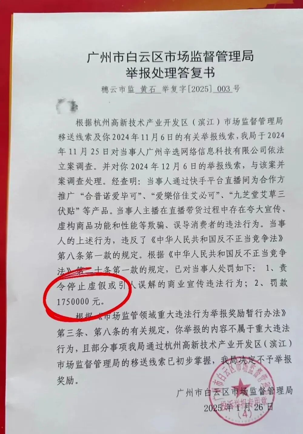 第三,对辛选公司处以175万元罚款,责令停止发布违法广告。