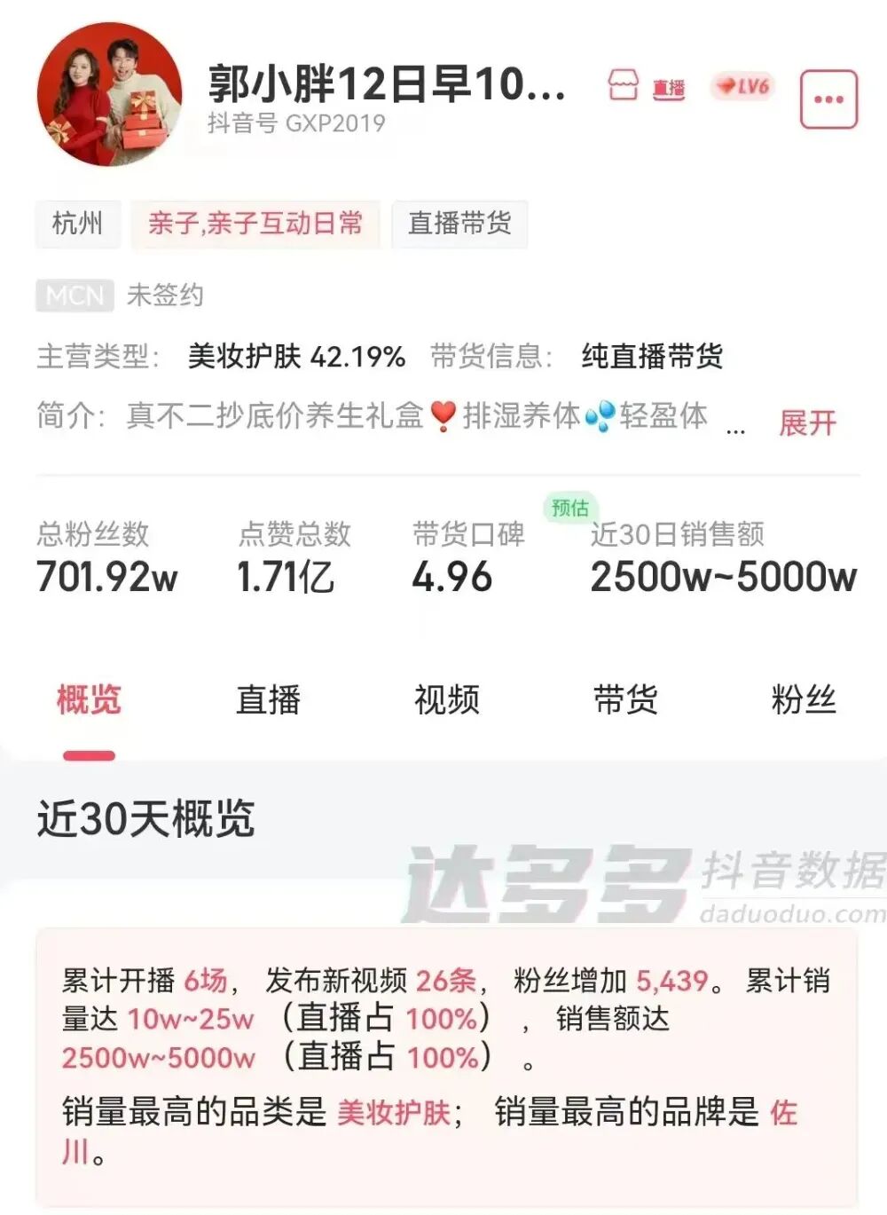 数据显示,郭小胖近30天的带货GMV在2500万到5000万元之间。